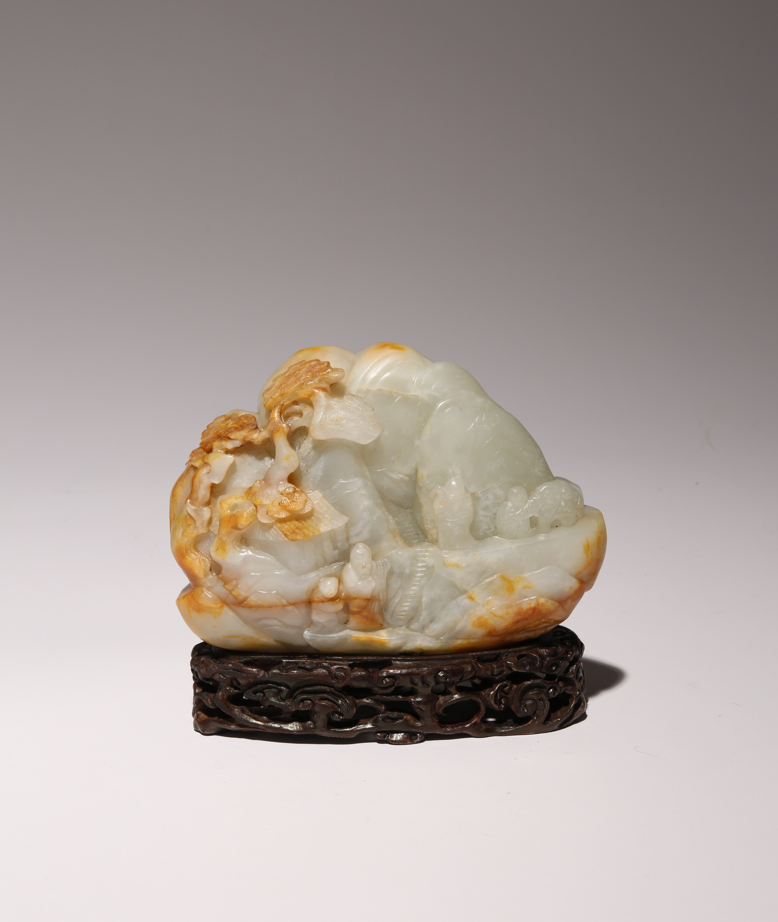 Carved in relief, with figures and a small hut beneath a pine tree, on a mountain ledge, the stone with russet inclusions, with a wood stand, 15.5cm. (2)