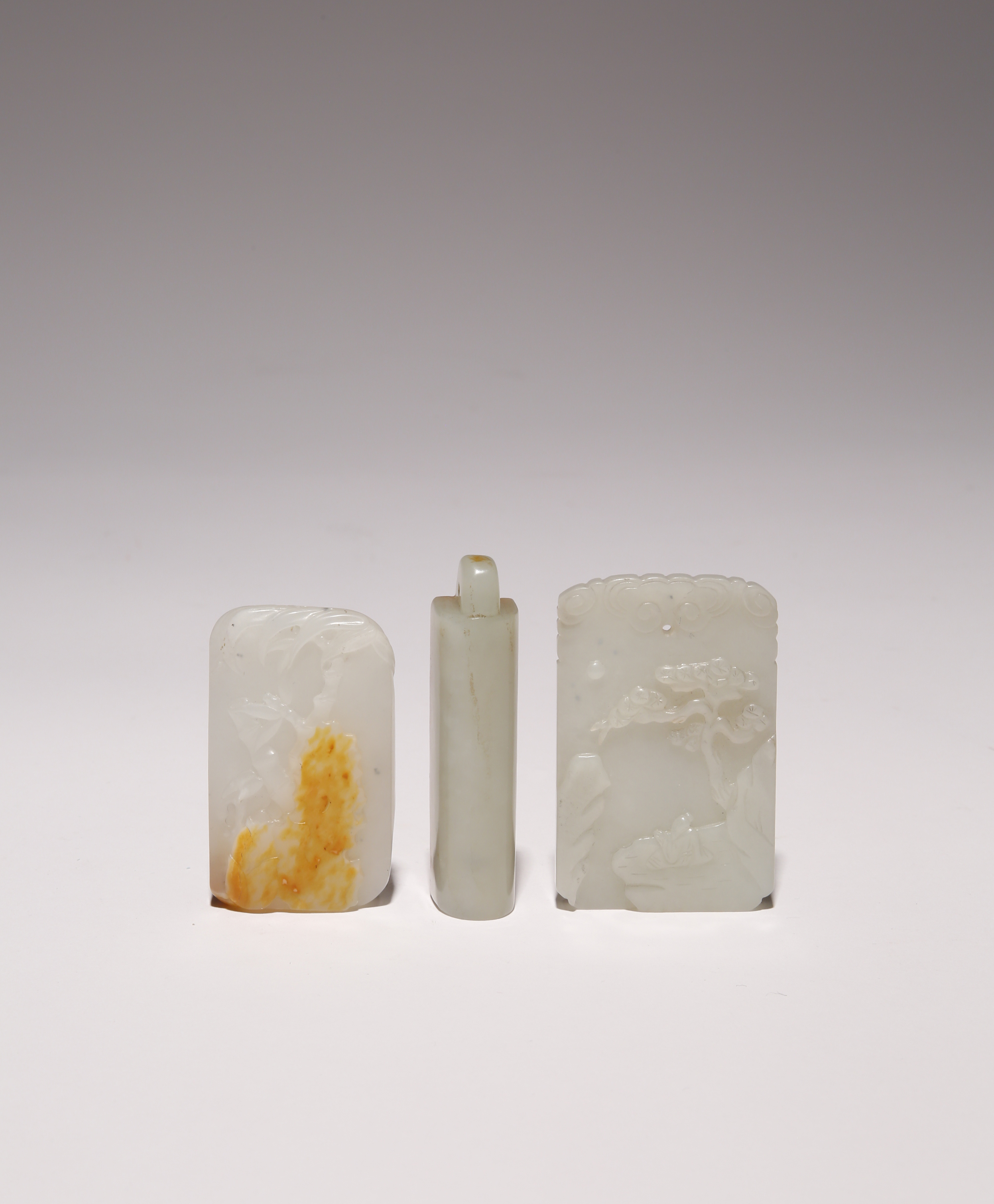 Comprising: a white jade rectangular pendant carved with bamboo and rockwork, a larger white jade pendant carved with a small figure beneath a pine tree, and a white jade hat ornament, 6.8cm max. (3)