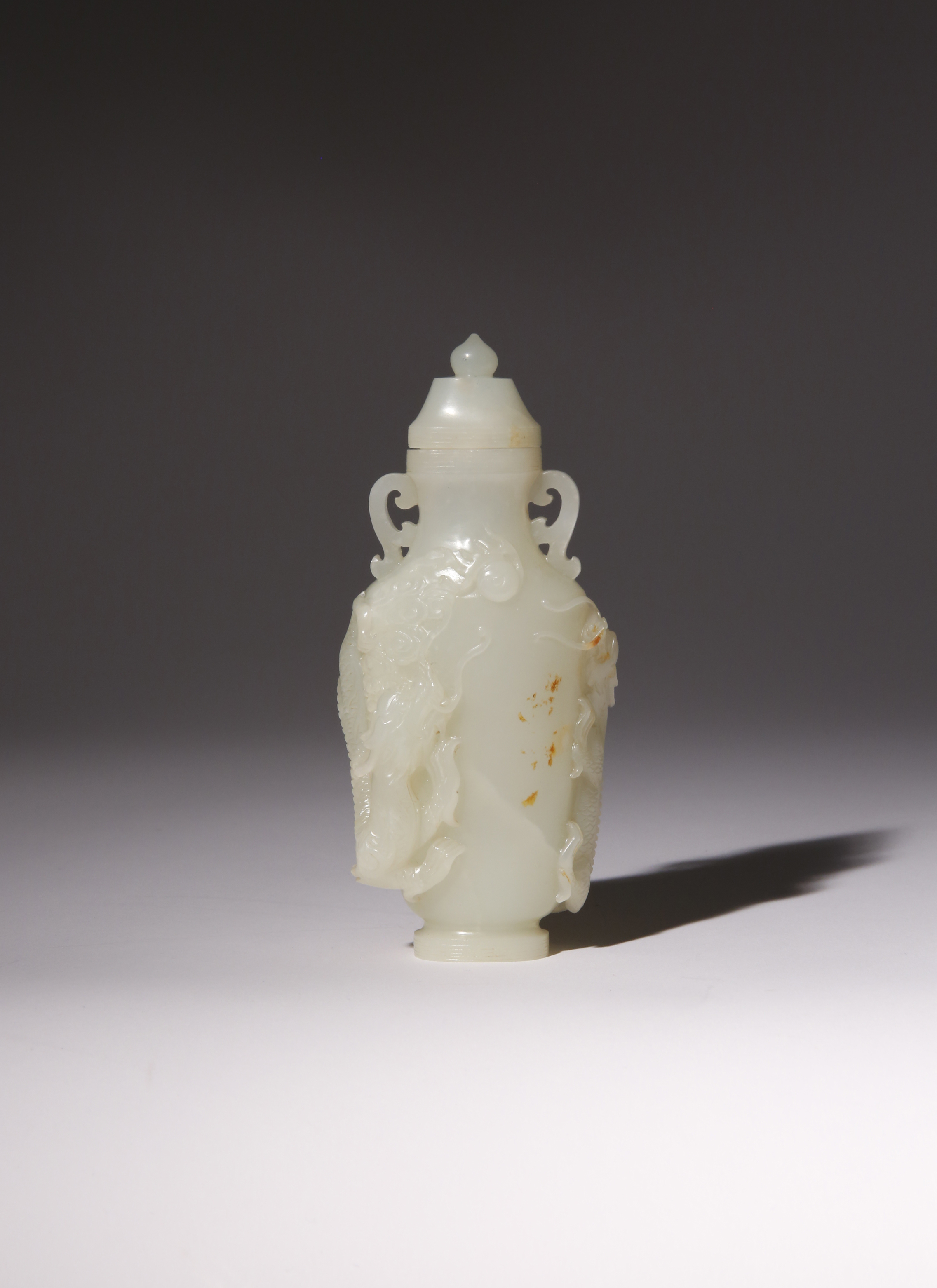 With scroll handles to the neck, the body carved in high relief with two scaly dragons chasing a flaming pearl, 13cm. (2)