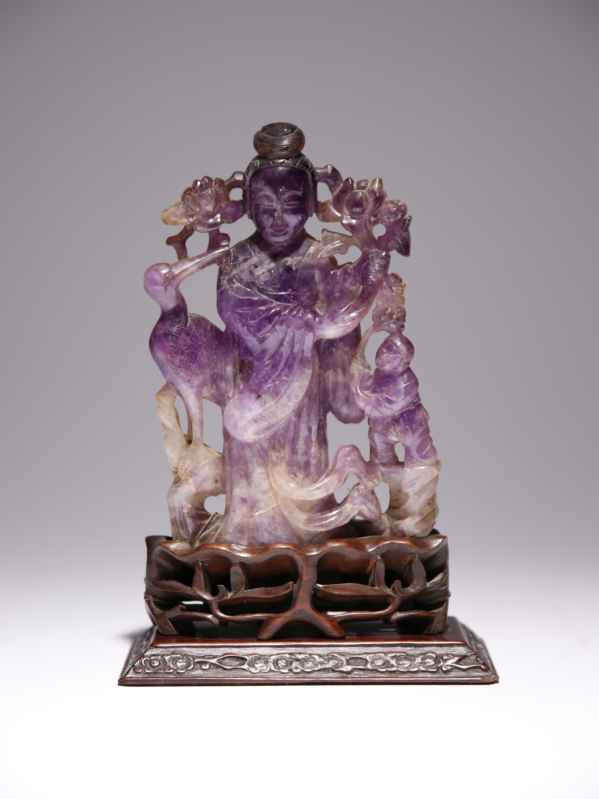 Standing, wearing long flowing robes, holding a lotus spray, flanked by a boy attendant and a crane, attached to a reticulated wood stand, the figure 16cm, 21.3cm overall.