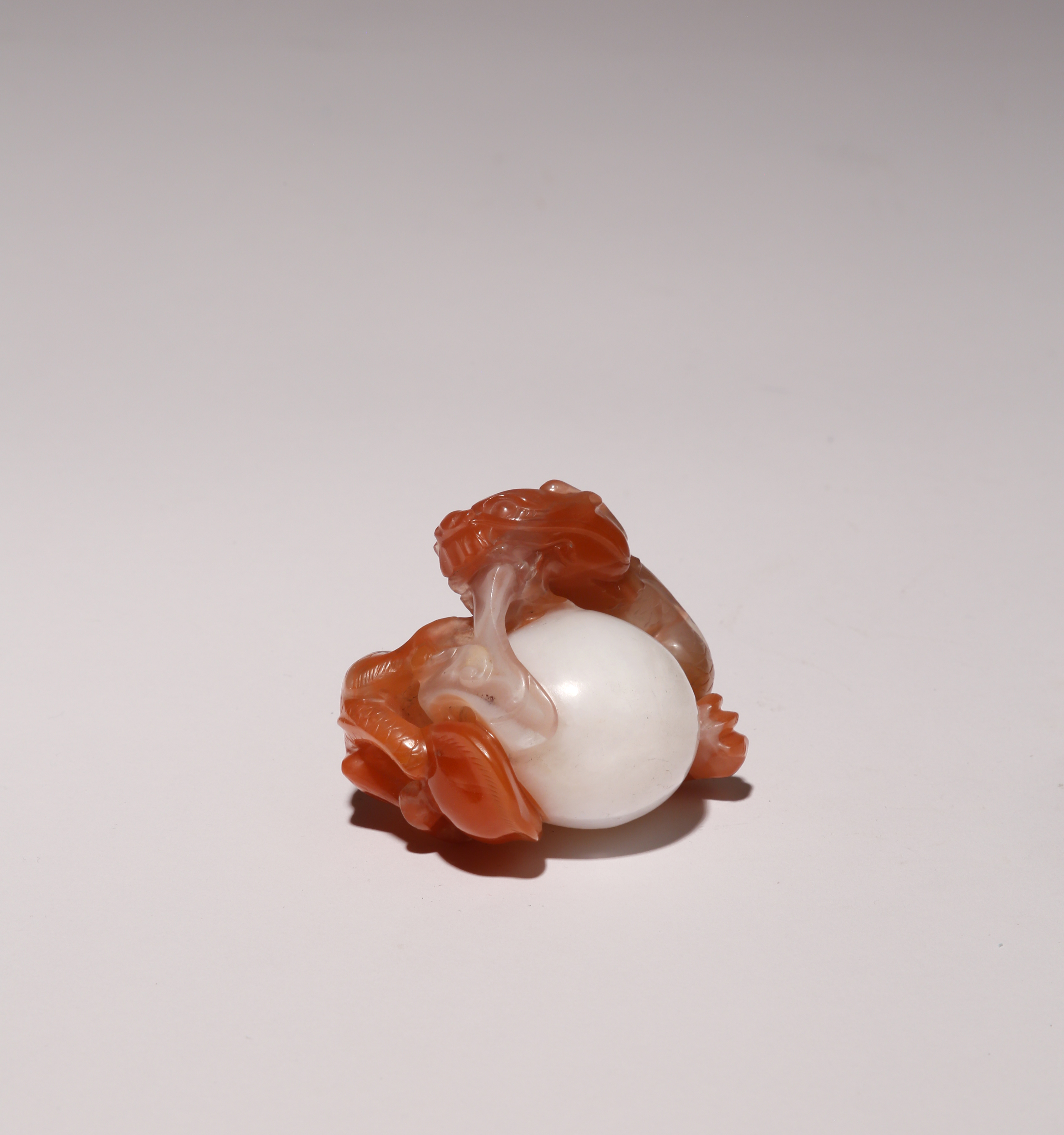 The mythical beast in a reddish stone, well defined and encircling a large white pearl of wisdom, 5.5cm.
