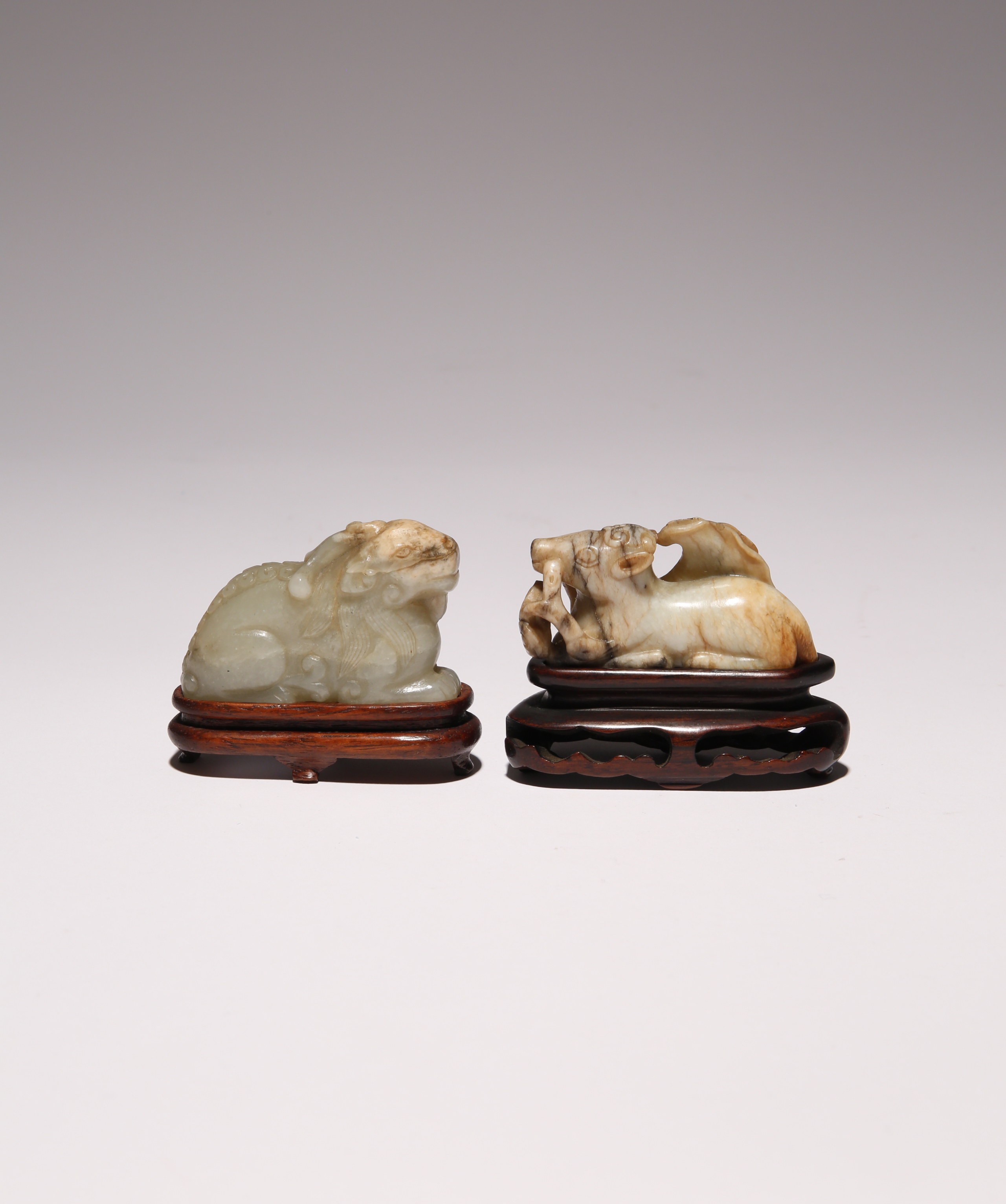 The former with a lingzhi spray in its mouth, the latter facing forward with well defined hair, spine and beard, each with a wood stand, 6cm. (4)