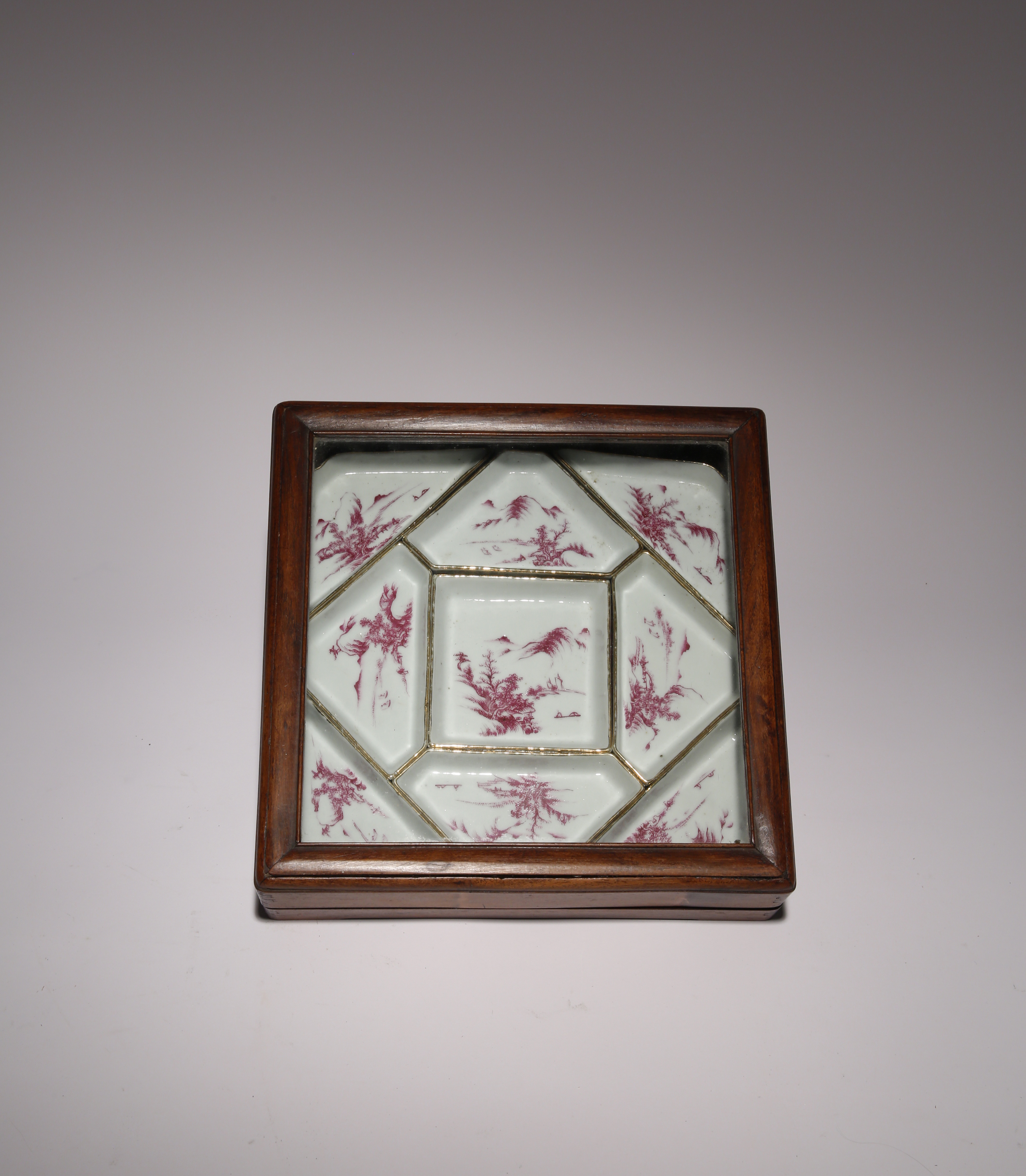 Comprising: nine dishes decorated in puce with various landscape scenes, the rims with gilt, contained in a wood box and cover, 28.5cm. (11)