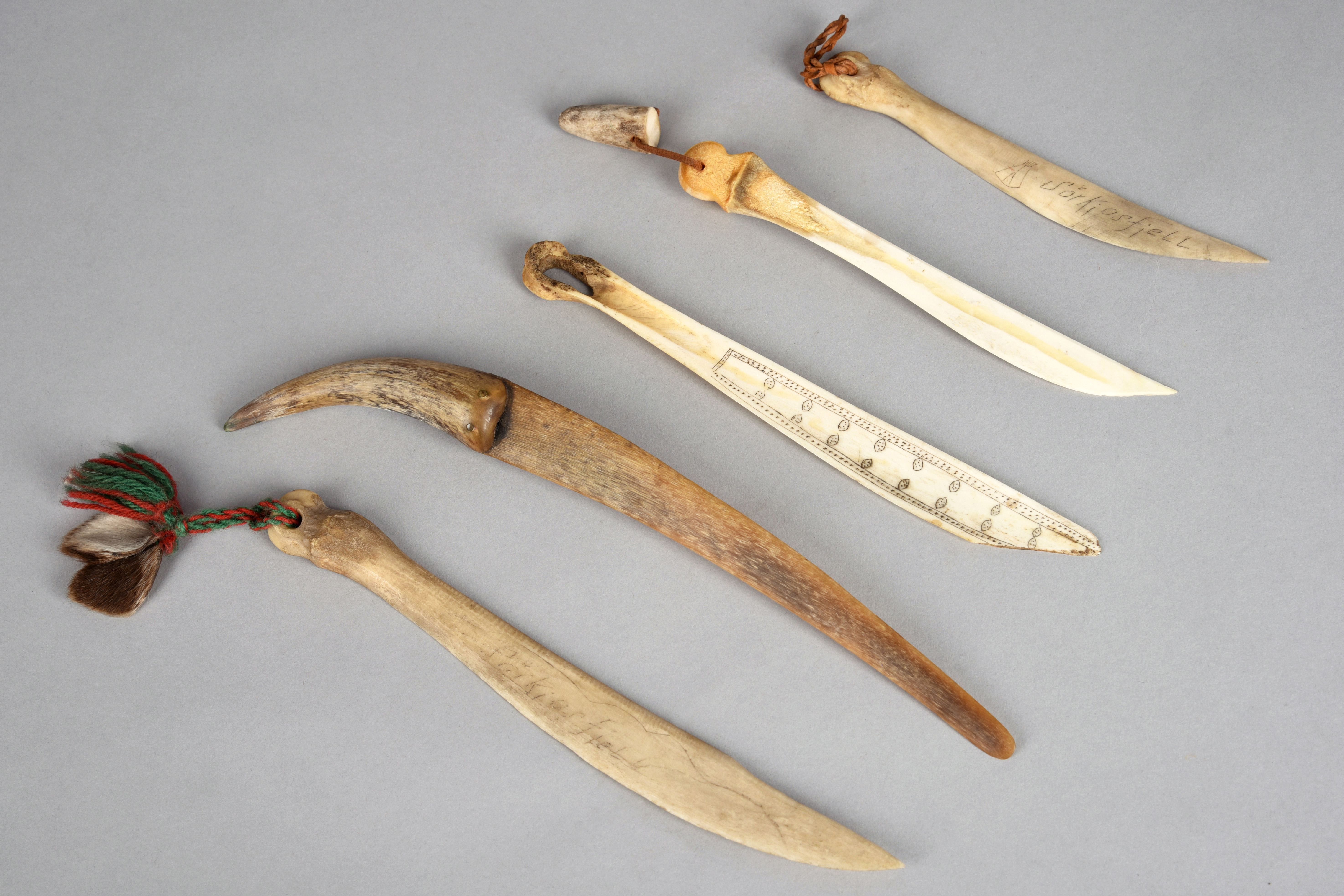 two inscribed Sörkiosfiell, another engraved with two caribou and framed fruits, the fourth with an antler toggle and a two part horn knife with copper rivets,
