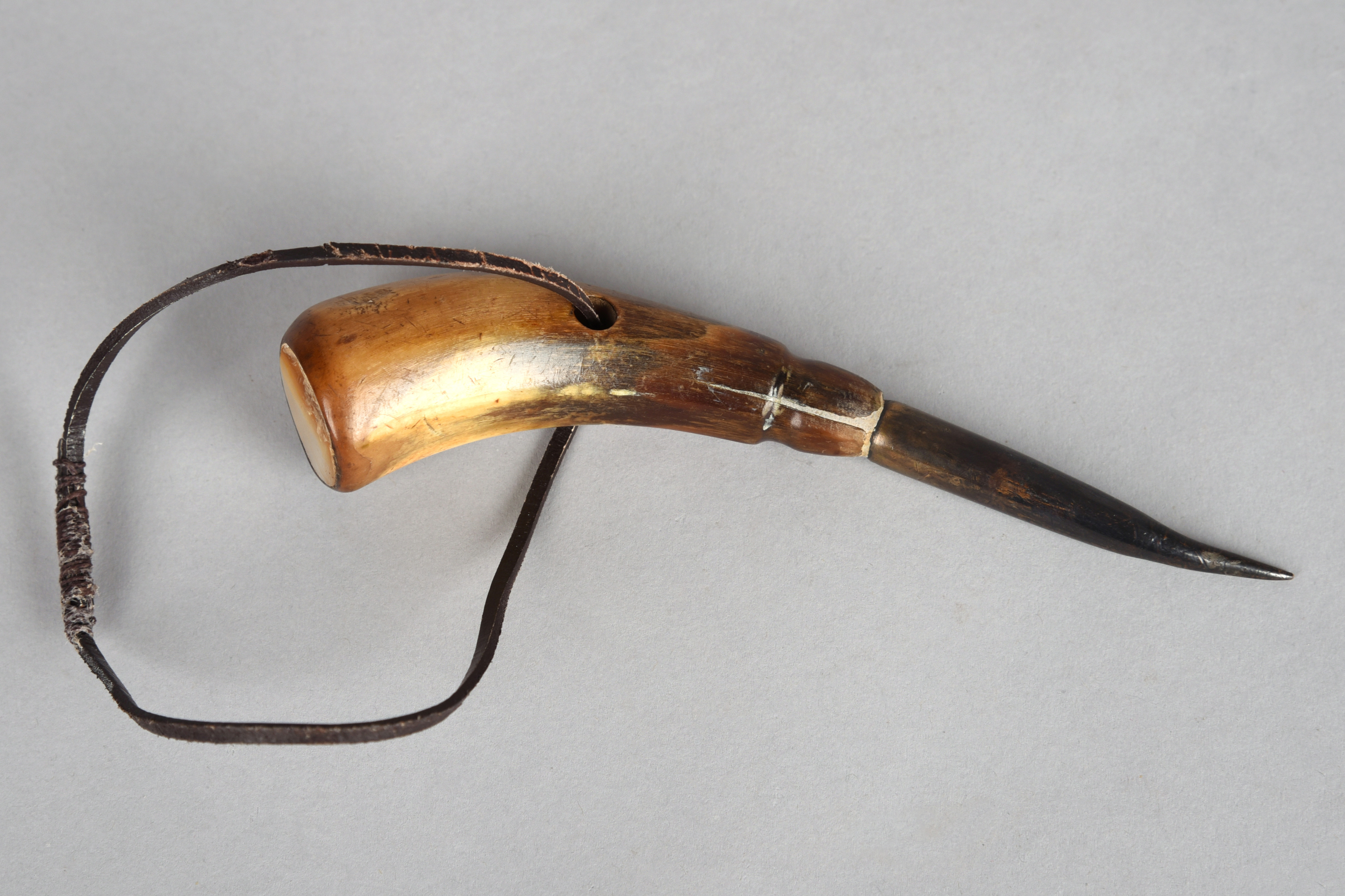 faceted and pierced in the centre for attachment, with a mother of pearl inset end and with a brass spike,
