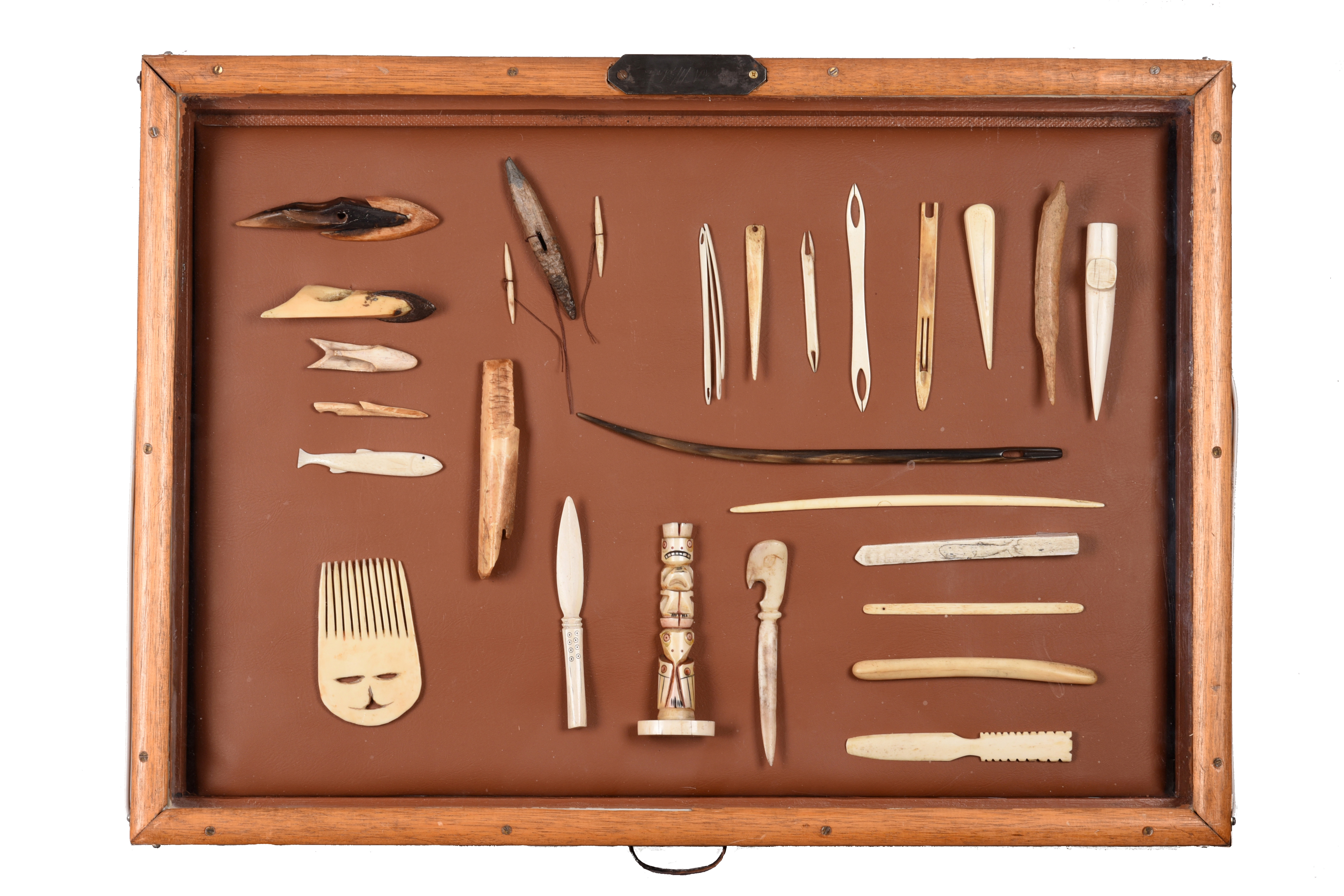 marine ivory, metal, bone and horn, including three harpoon heads, shuttles, needles, knives, fids, a model totem pole, a model fish and a comb with a pierced face design, mounted and cased with a hinged glazed lid. (29)