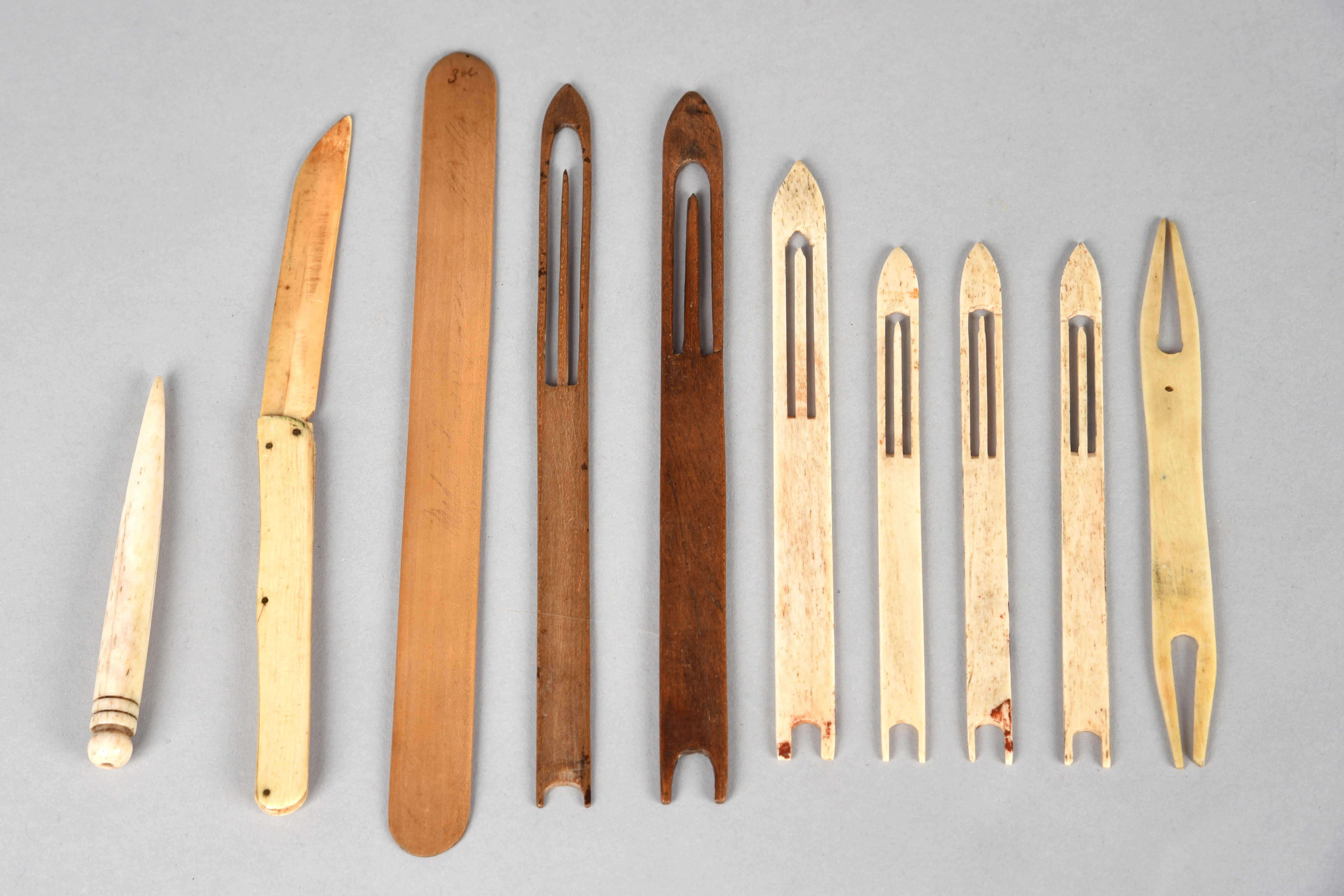 an Inuit net bobbin, an awl and a model folding knife, marine ivory, and a wood stave, with a faint pencil inscription. (10)