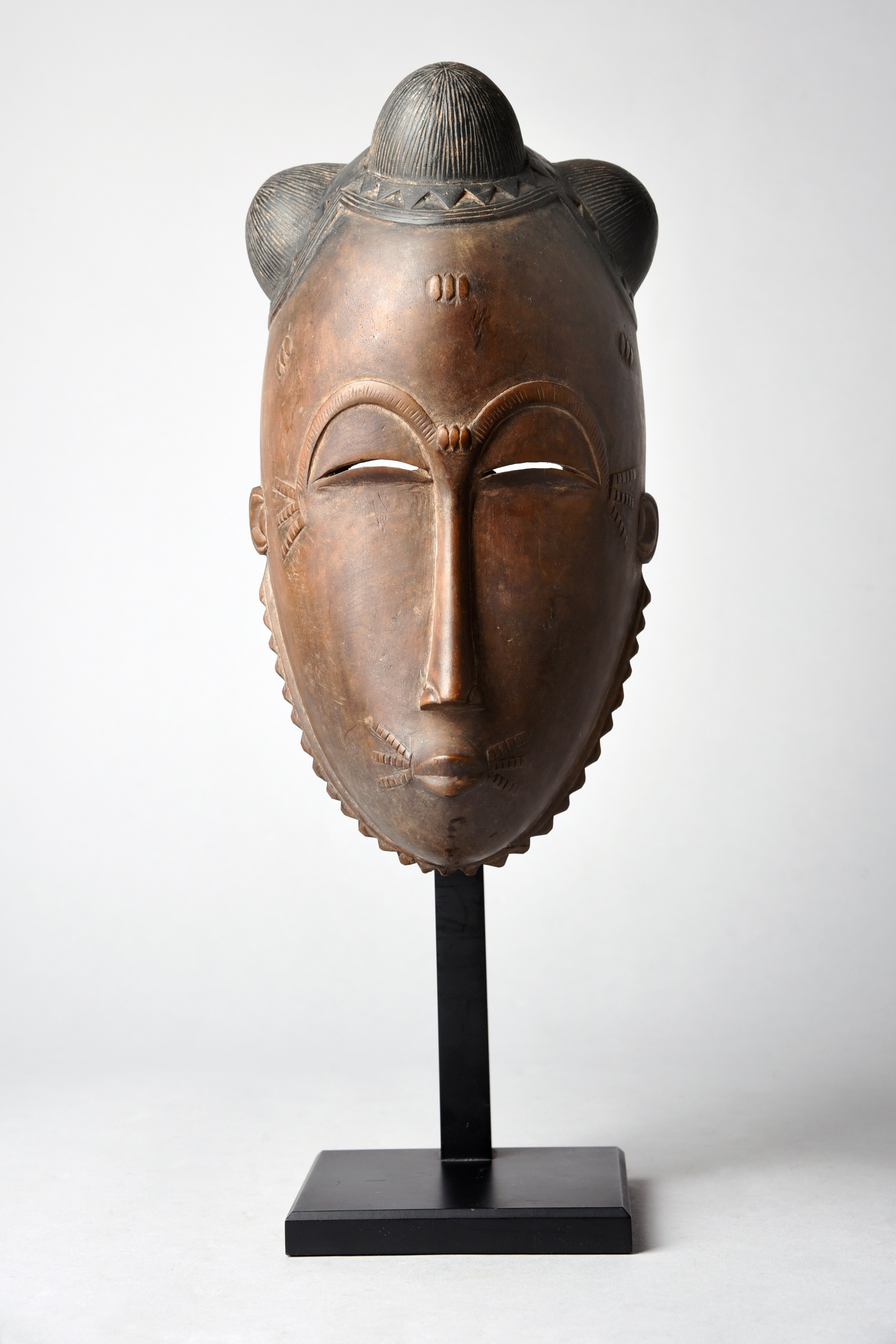 finely carved with a quadripartite domed and ebonised coiffure and with facial scarifications, curved slit eyes and a slender nose with arched brows, with pursed lips and a jagged beard,
