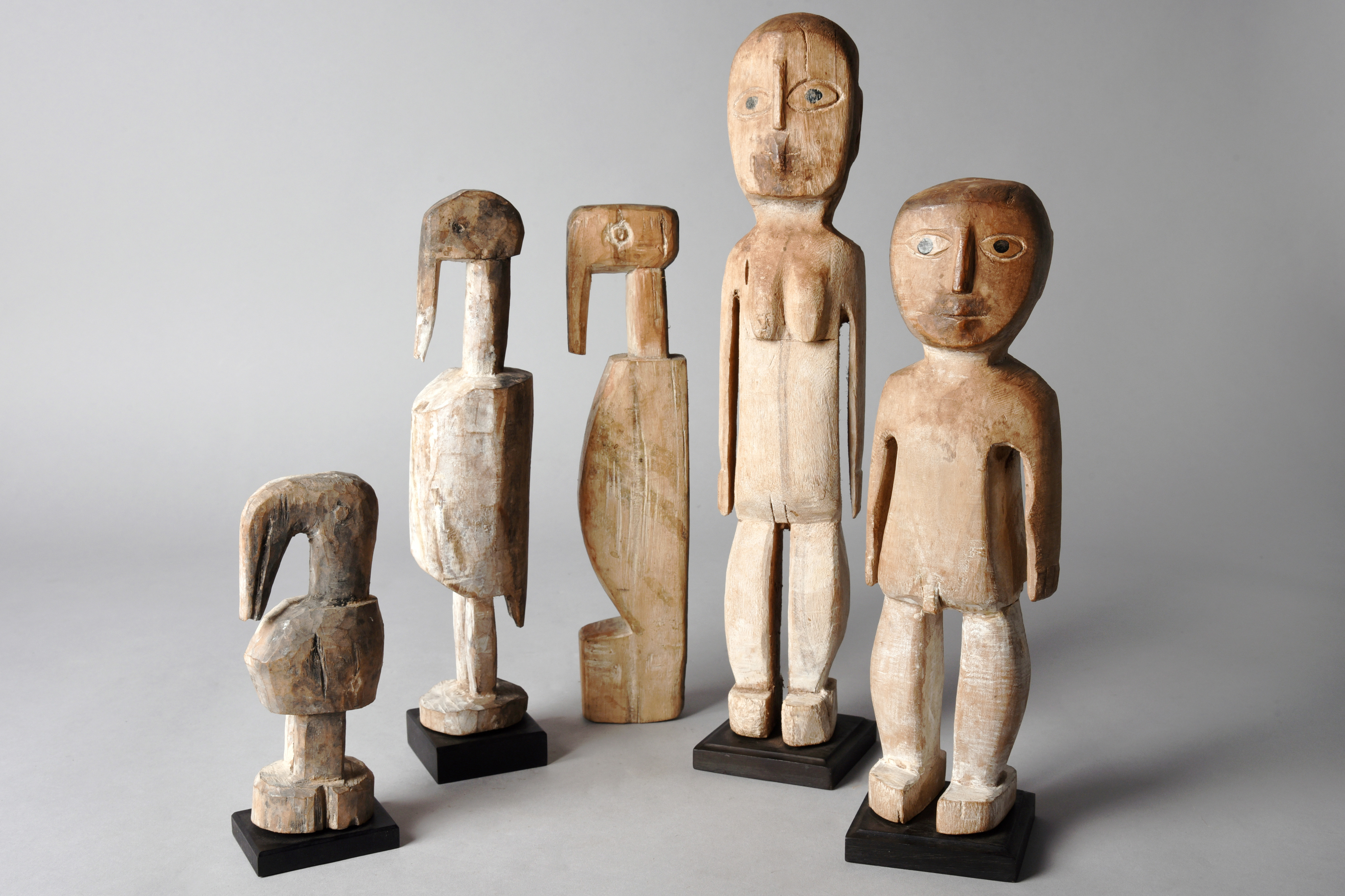 and a pair of Ada figures, male and female, with pigment, 30.5cm and 38.5cm high, on stands. (9)