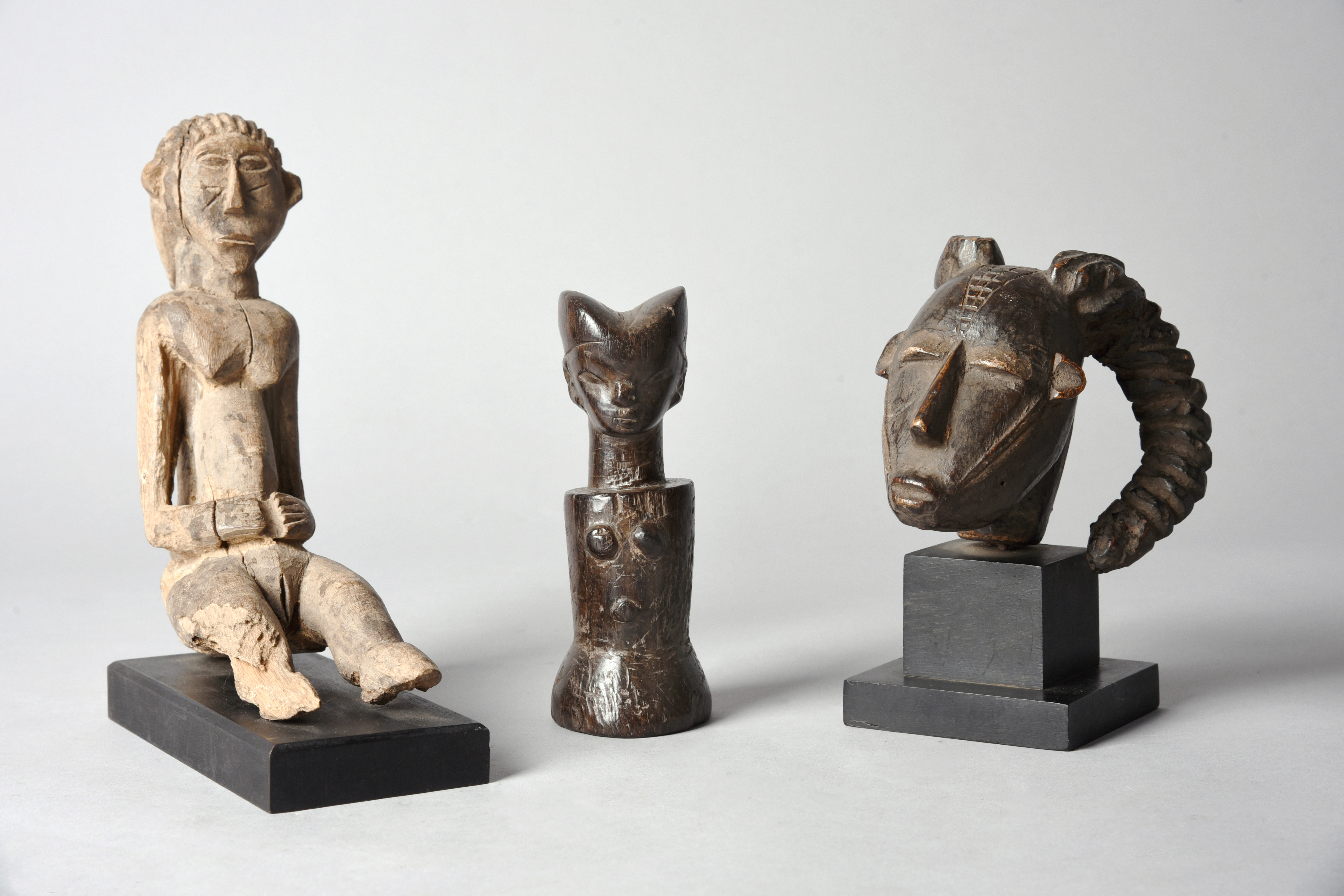 a Kwere doll, 14.2cm high and a Mali staff finial, a head with scarifications and a pair of antelope horns, 10cm high, on a stand. (5)