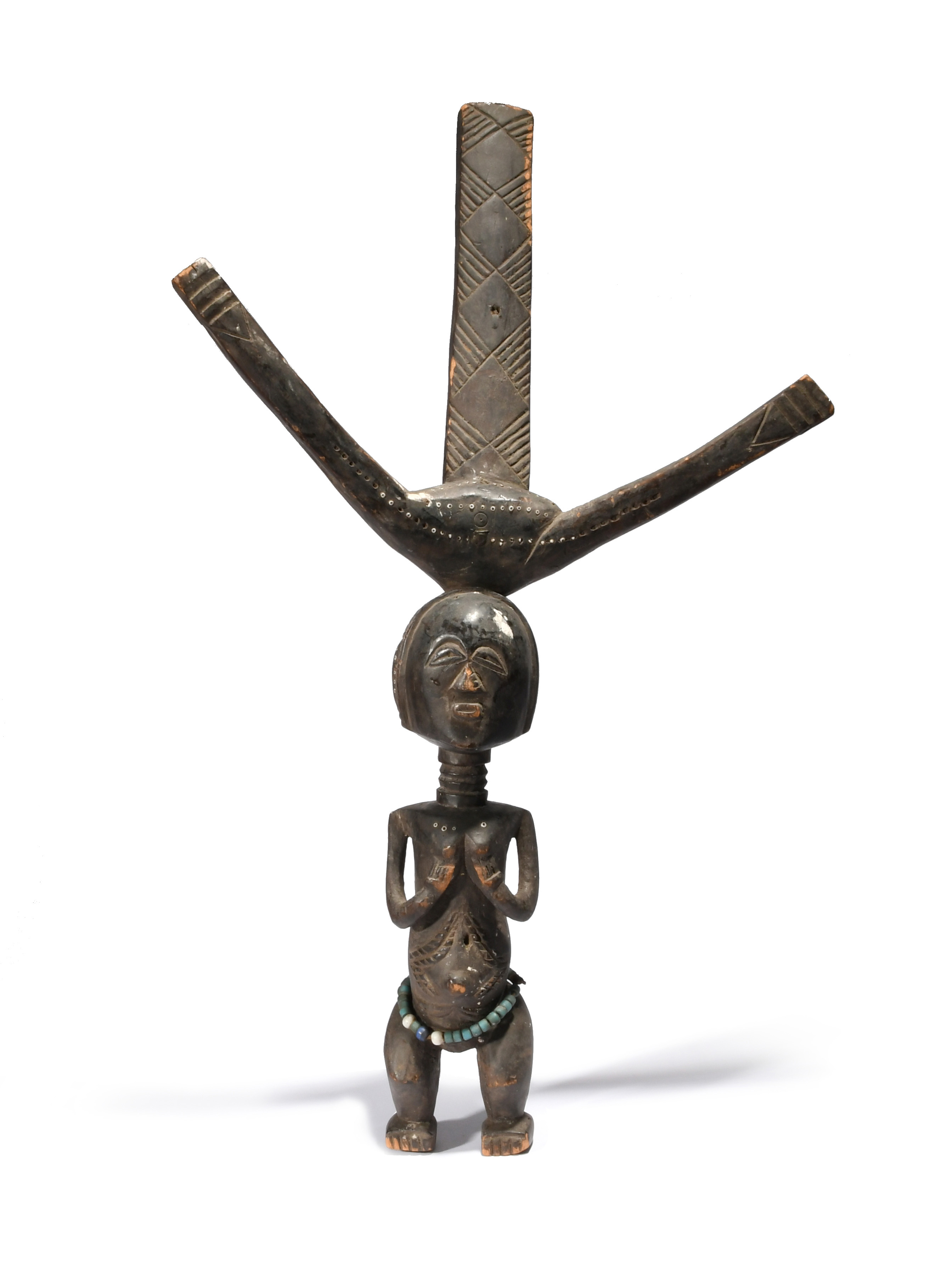 with inset white glass beads, the standing female figure with body scarifications and her hands to her breasts, with a cross back coiffure and a tripartite surmount,