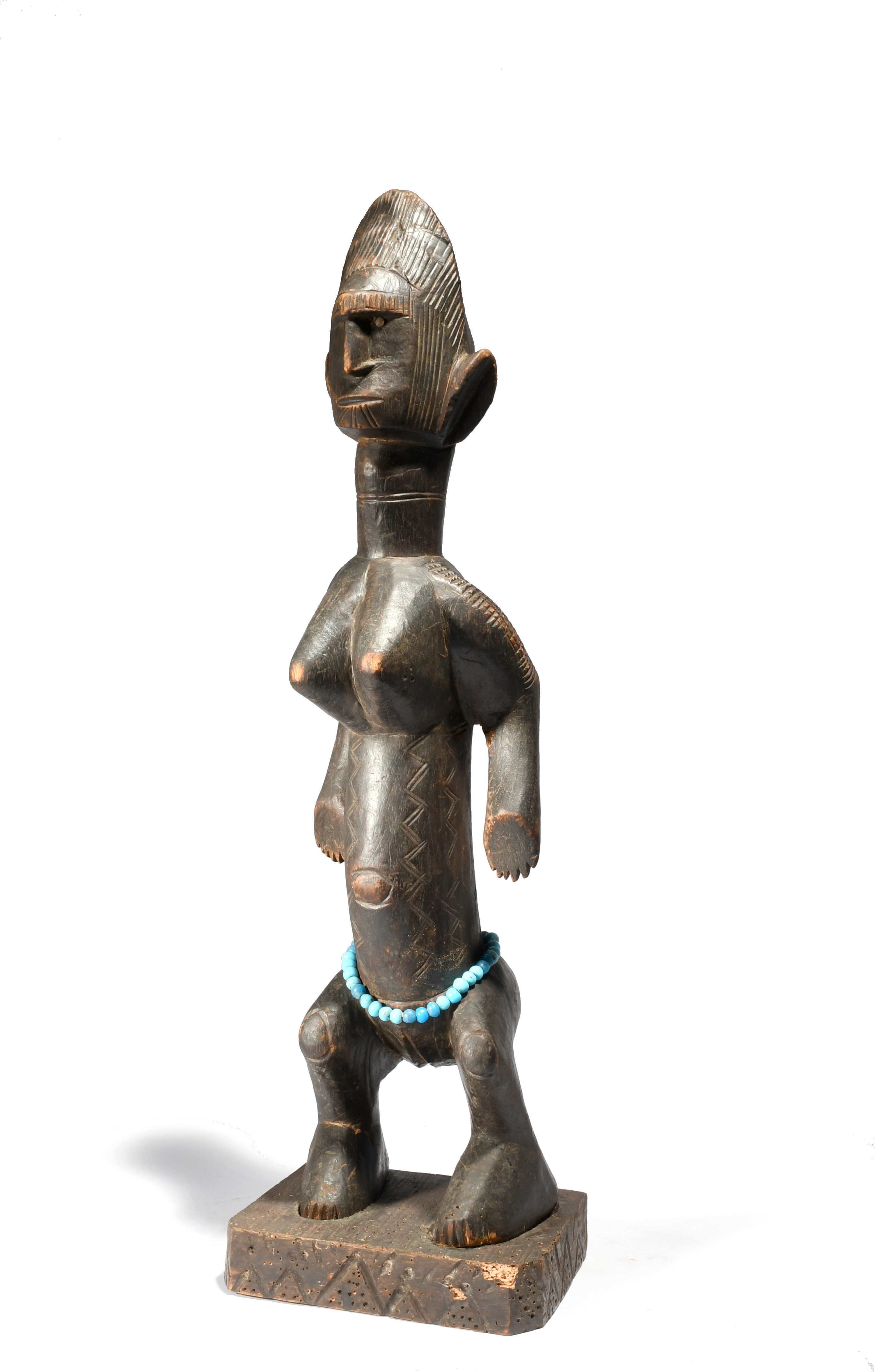 with carved decoration to the high coiffure, face, shoulder and abdomen, with nail eyes and a glass bead waistband,