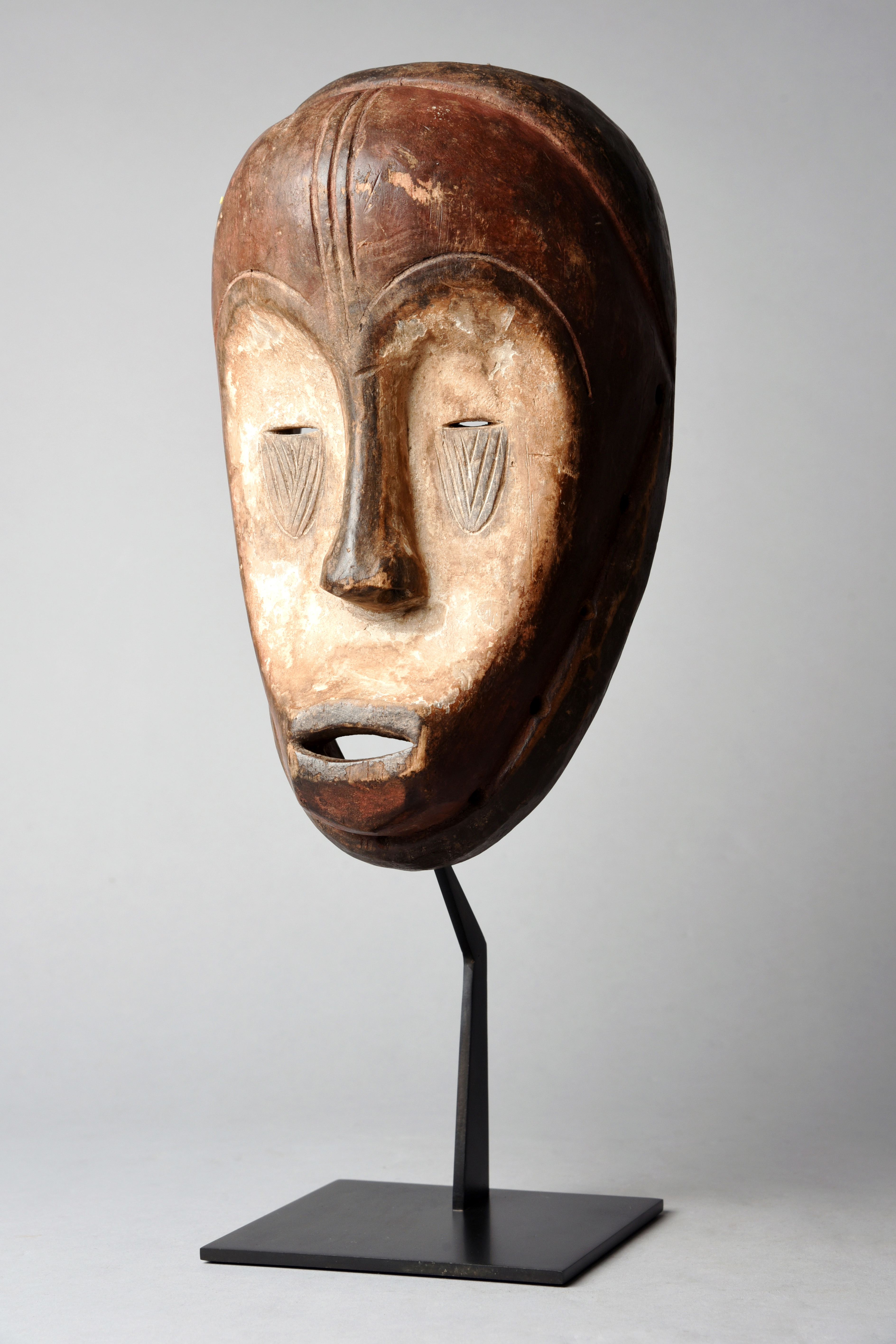 with three vertical lines down the forehead and with scarifications under the eyes, with kaolin, red and black pigment,