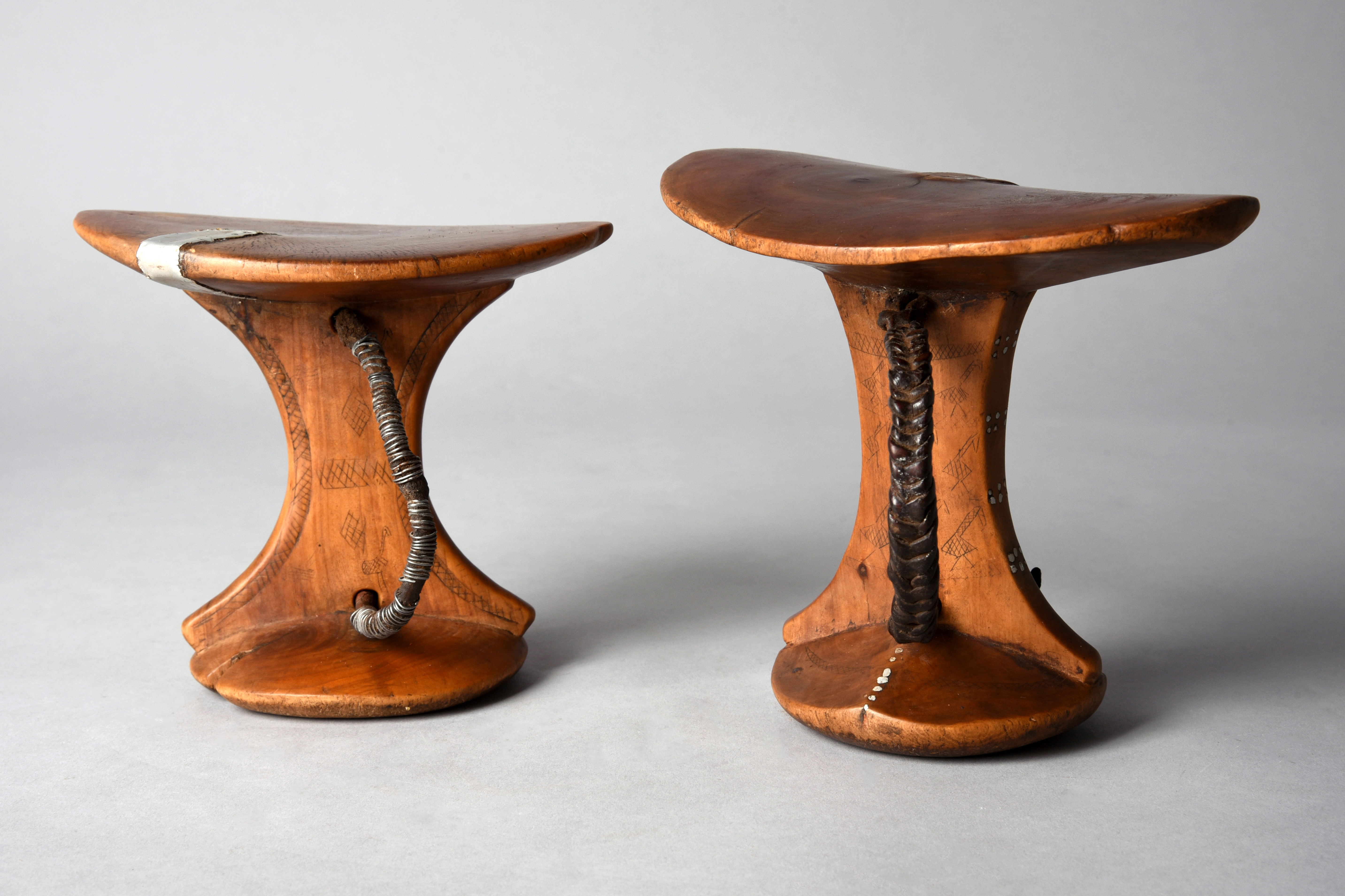 and a similar Kaara headrest, with ostrich and geometric decoration, with a leather and wire handle, 14.5cm high. (2)
