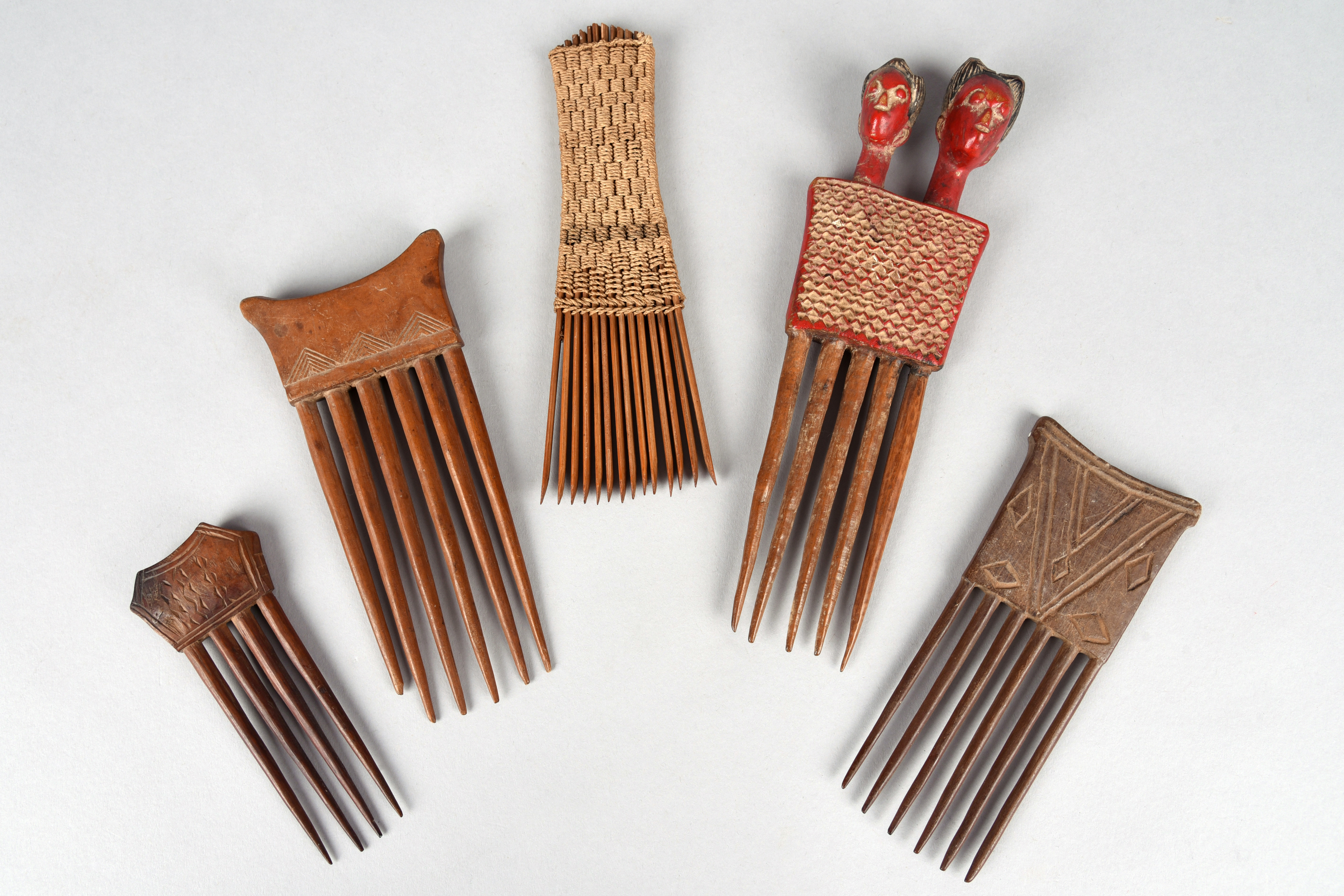 three Baule combs with carved decoration and a Mangbetu fibre bound comb. (5)