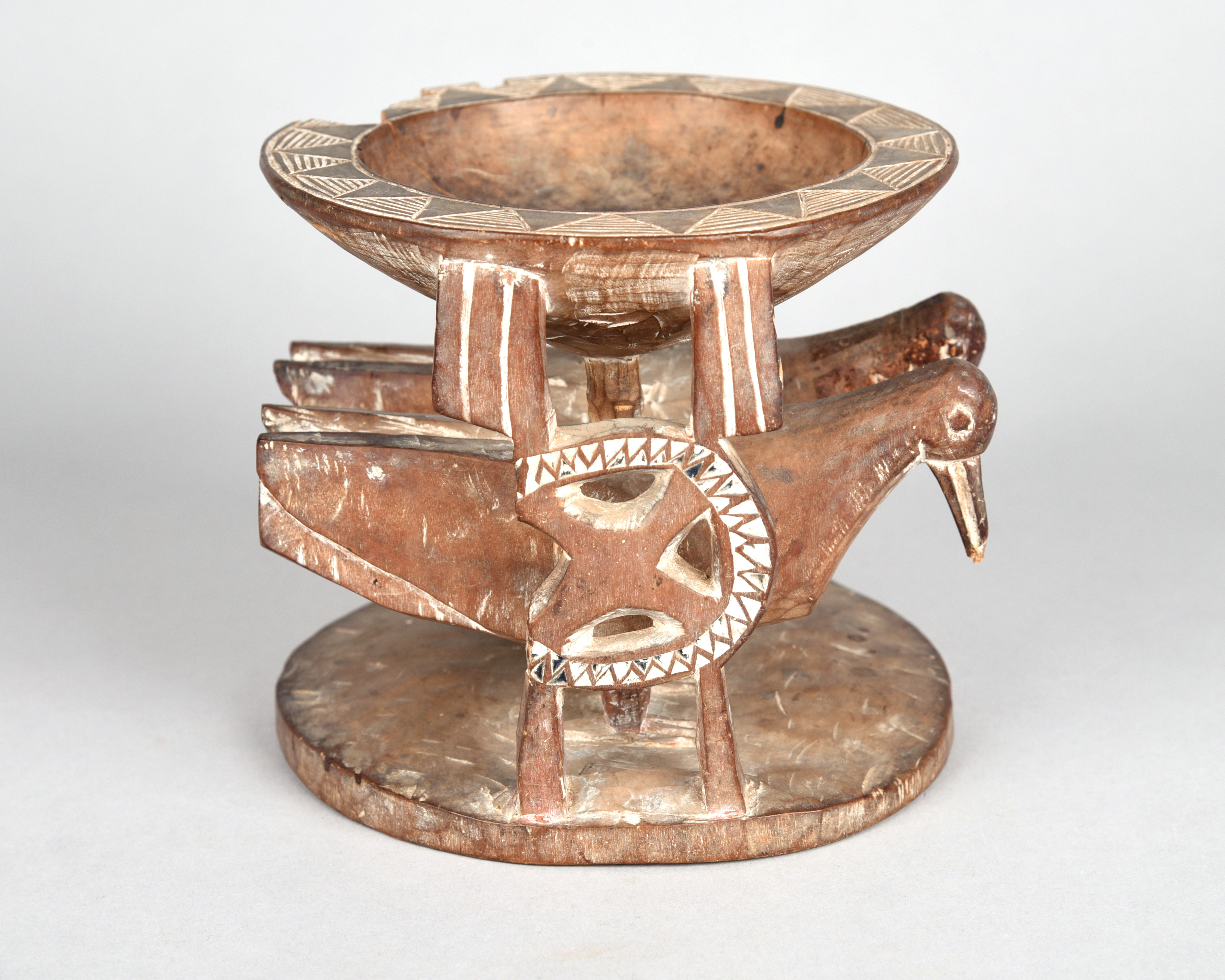 with a pair of carved birds and open supports, the bowl rim with chevron and linear carved decoration,