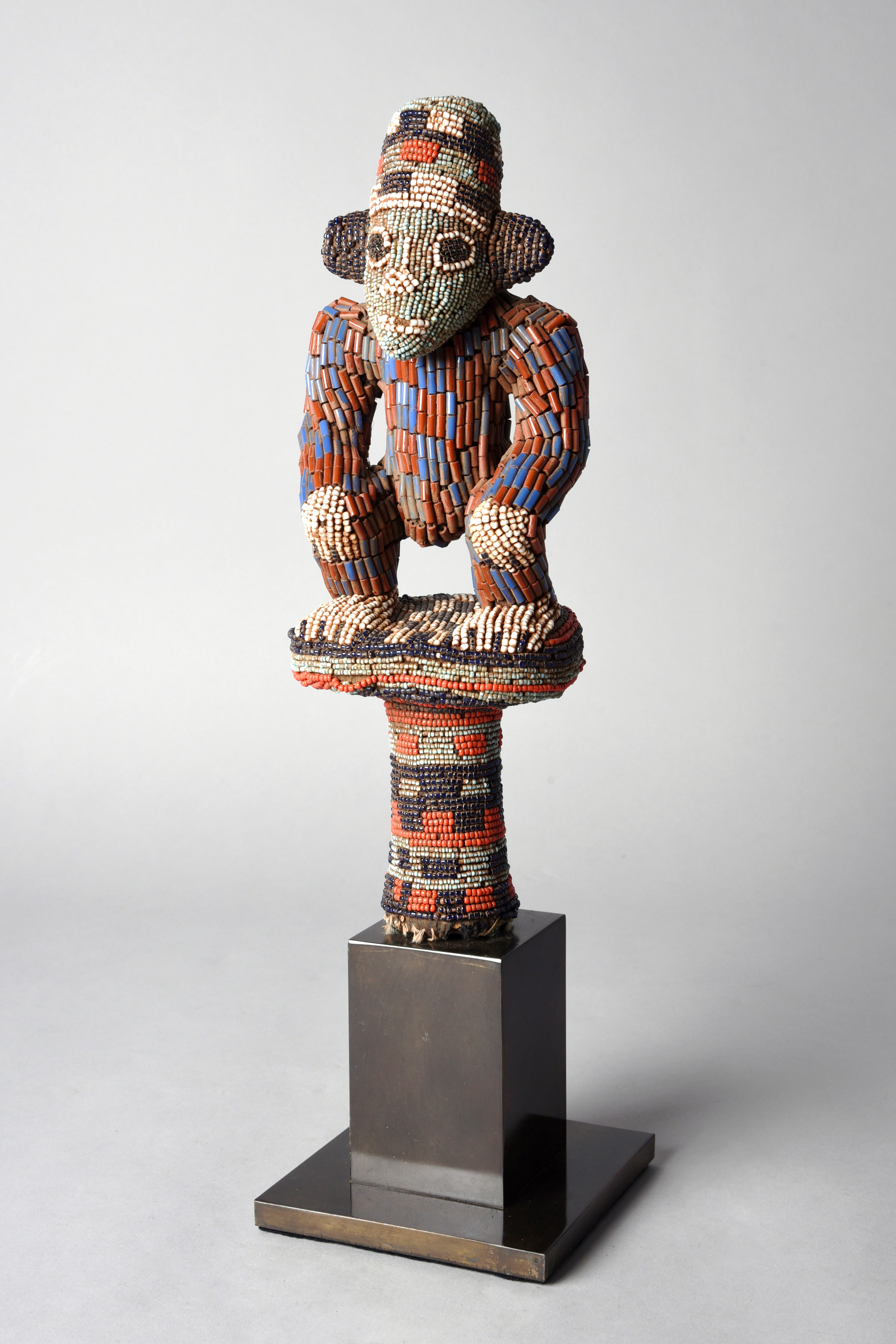 wood, cloth and coloured glass beads, modelled with a squatting monkey,
