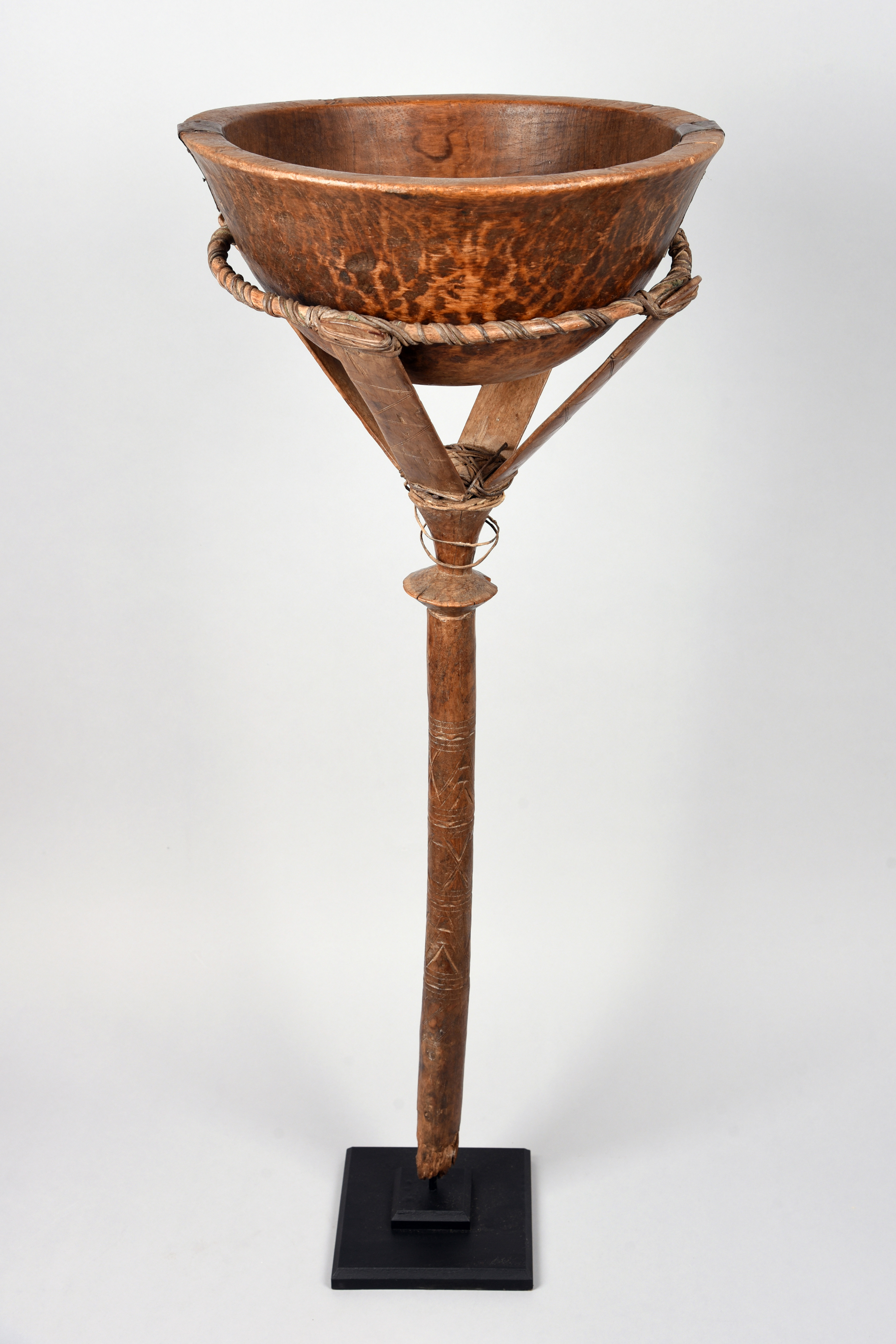 with a slight flared rim with carved decoration and sheet metal repairs, 46cm diameter, the stand with leather binding and carved decoration, 100cm high, together 107.5cm high, on a base. (3)