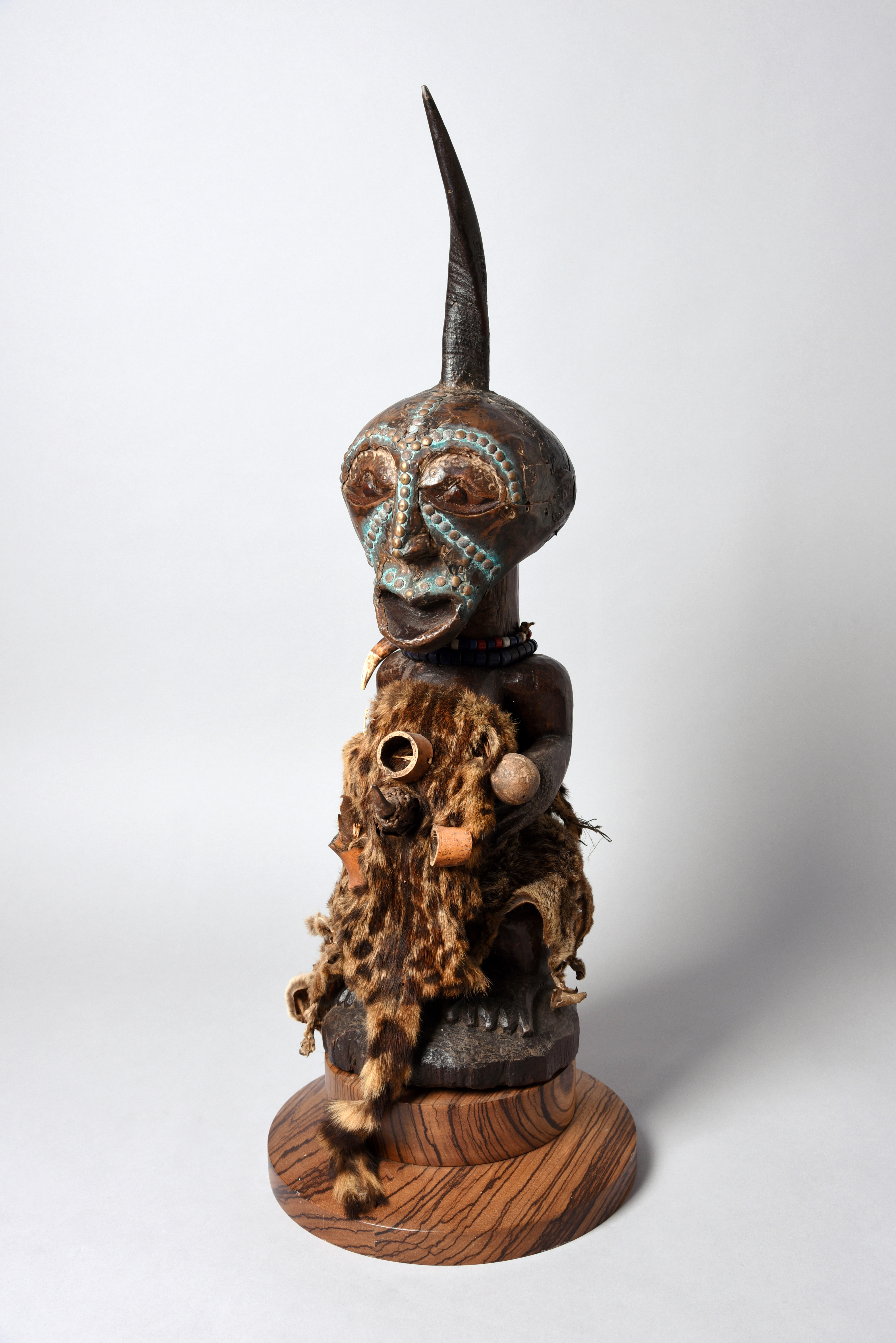 the head with applied sheet brass and studs with an inset horn to the top, with his hands placed on his abdomen and with a further inset horn charge, wearing feline pelts and a glass bead necklace with an animal tooth, 20th century,