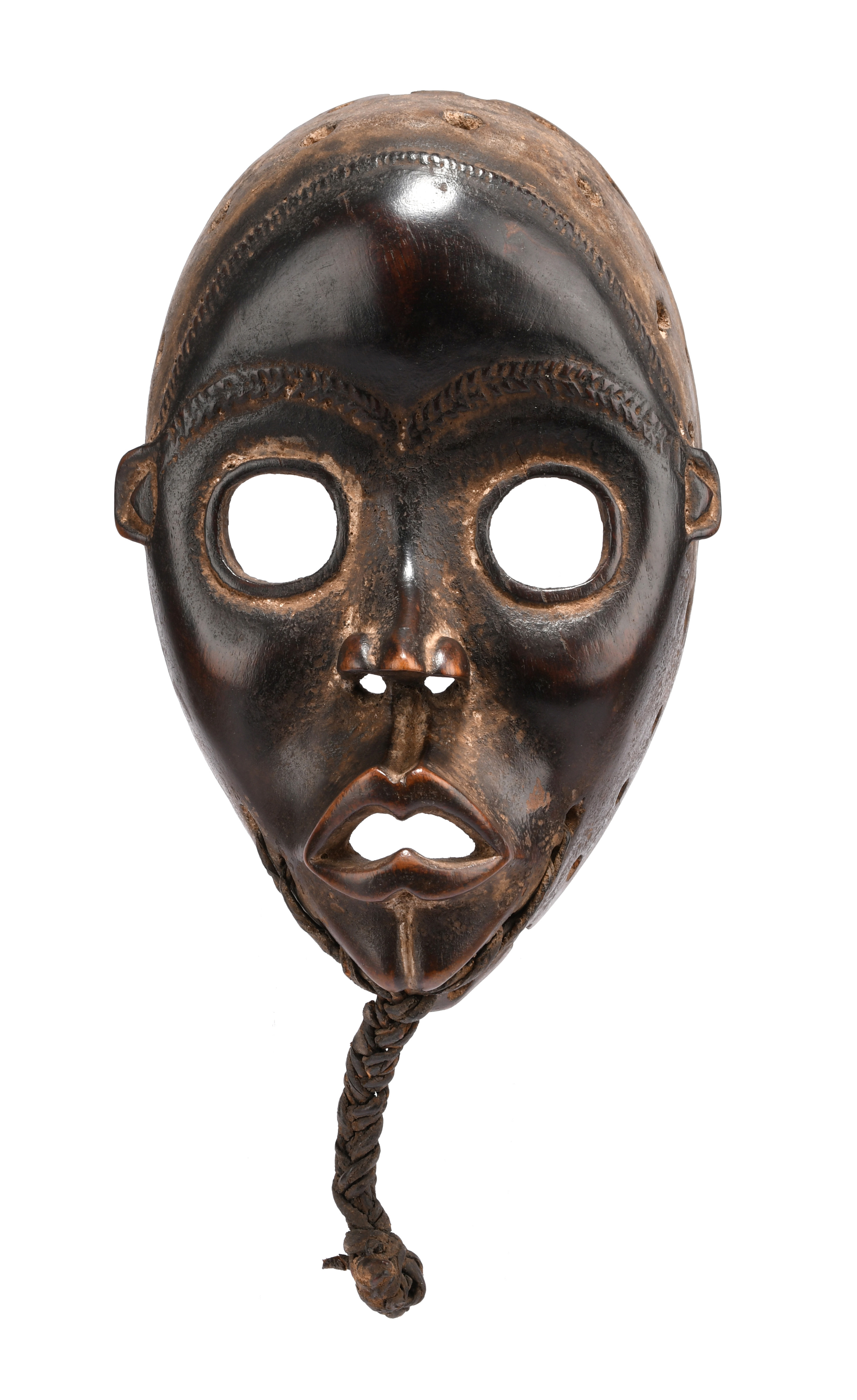 with relief eyebrows and forehead coiffure line, with a plaited hide beard and remains of white pigment,