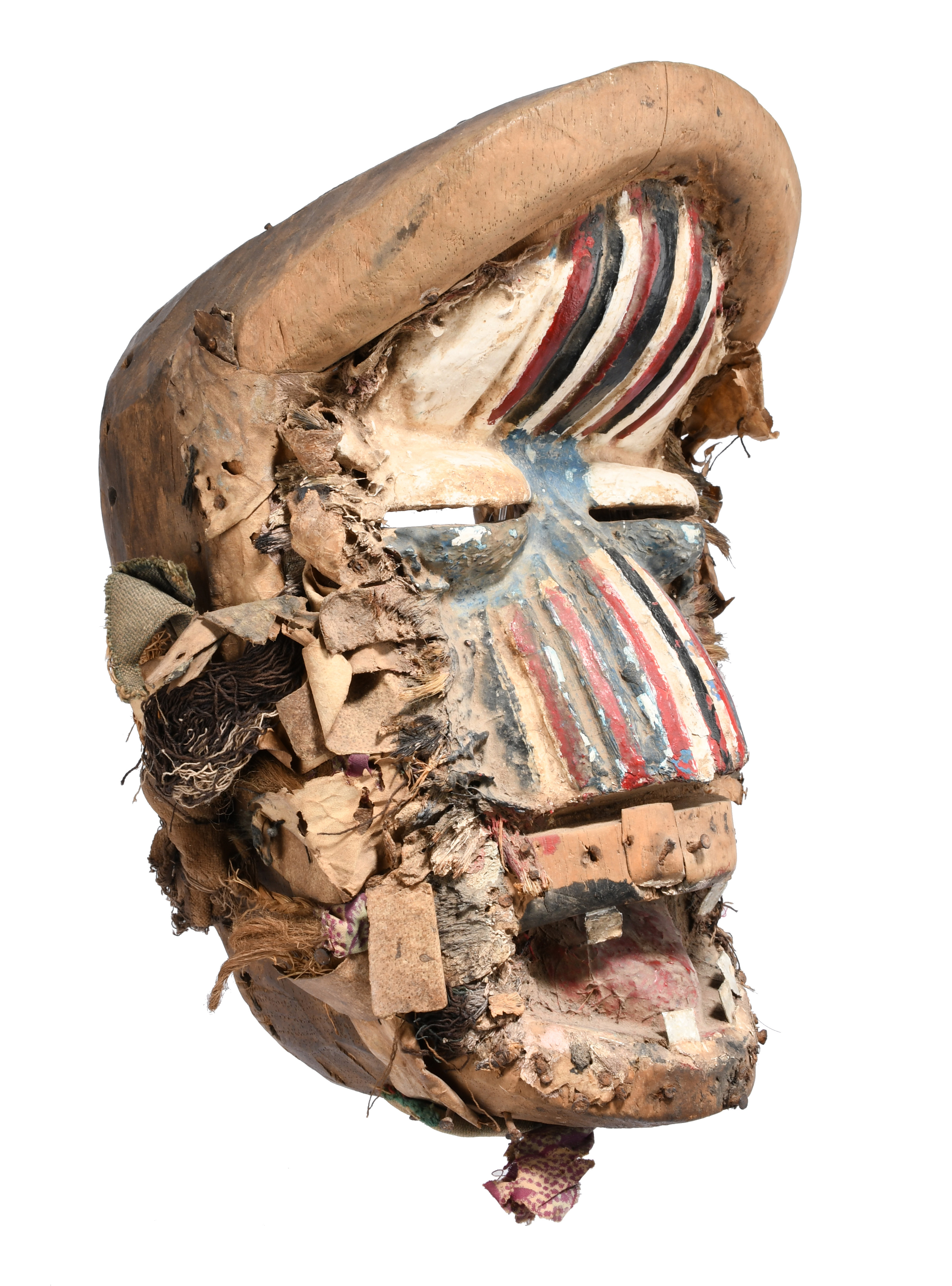 with applied hide, fabric, fibre, nails and aluminium, the grooved forehead, nose and bulging eyes with painted decoration,