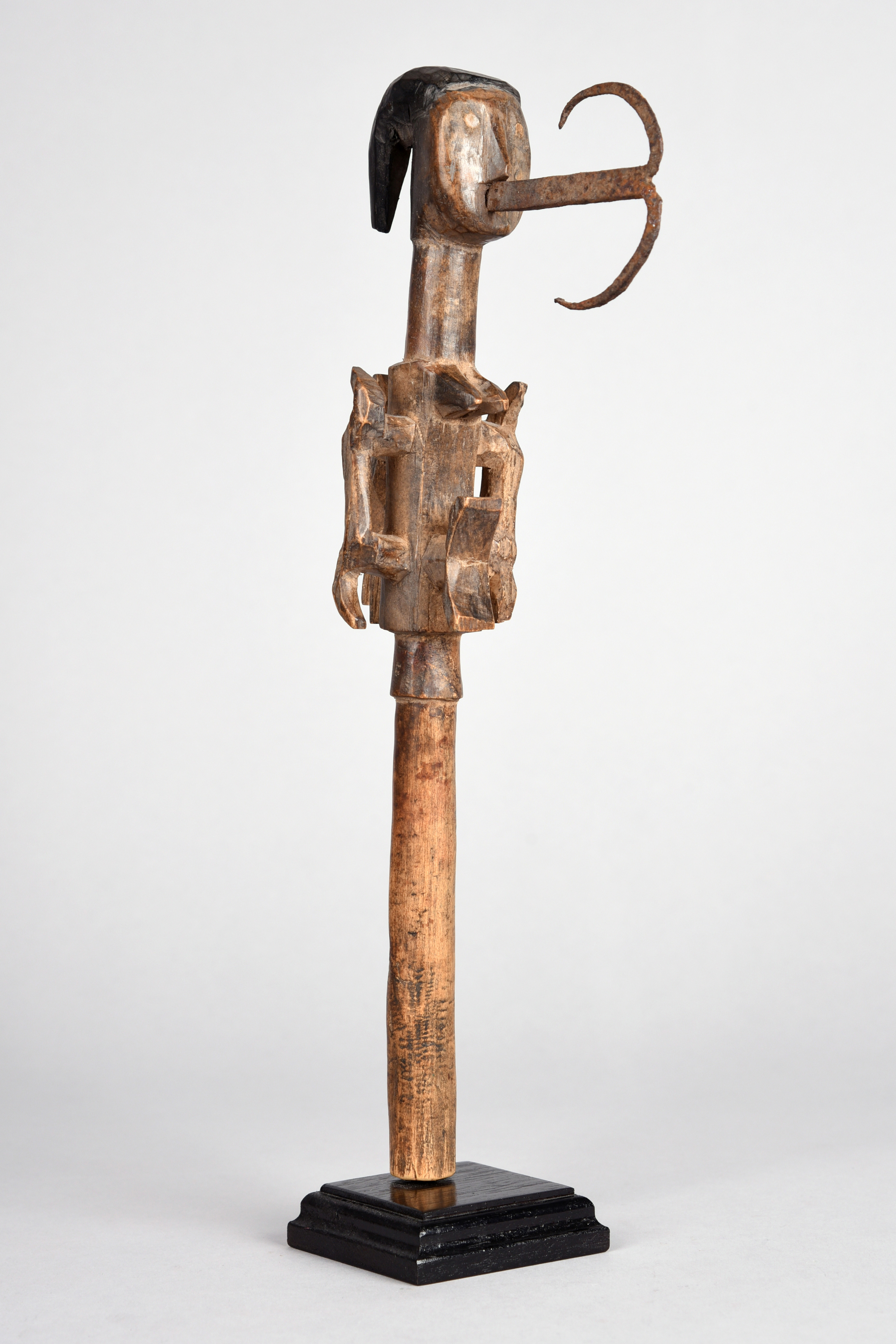 carved with a female bust, three animals and a stool, with an iron bifurcated blade,