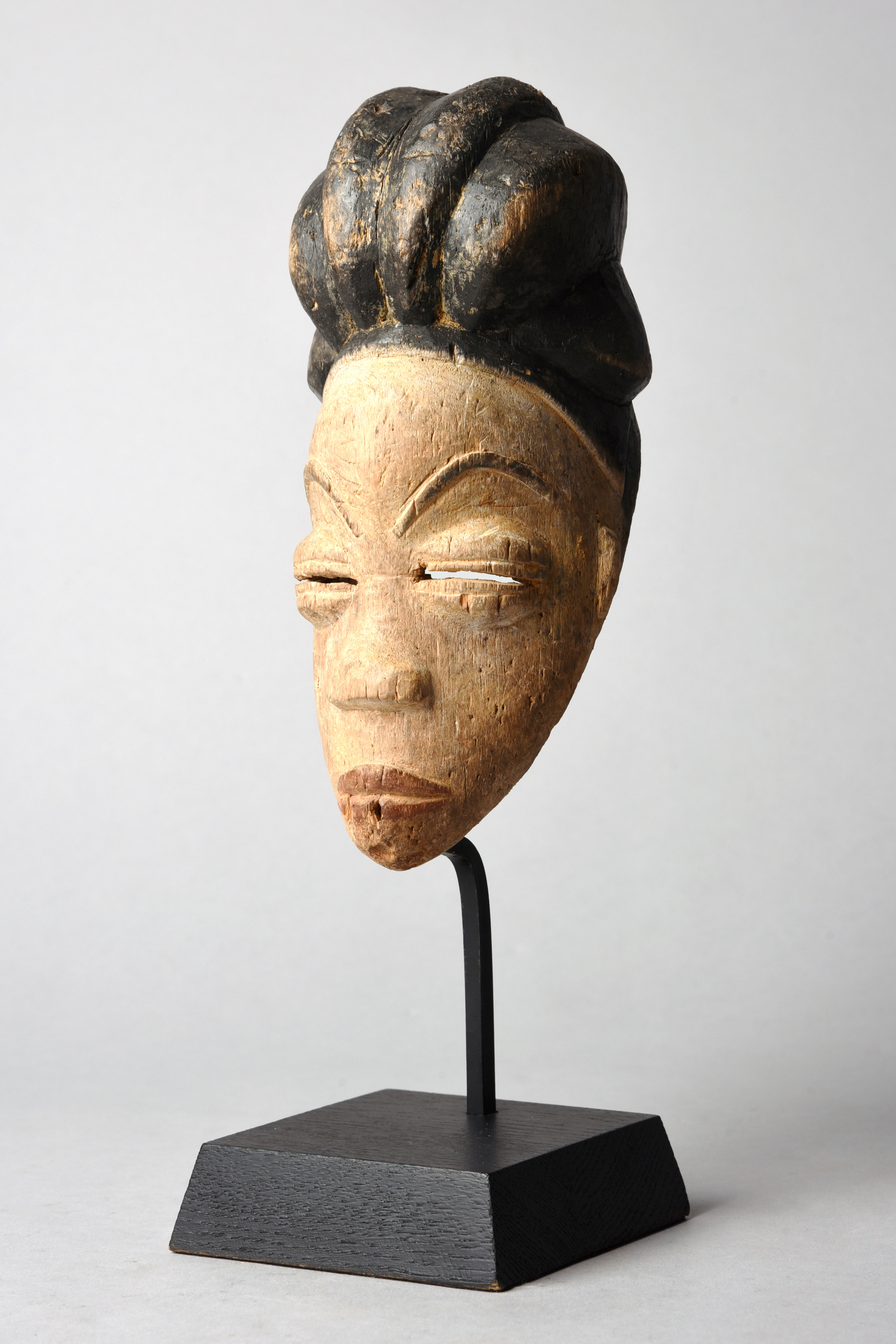 with a ribbed coiffure, slit eyes and pursed lips with black, red and traces of white pigment, with a hole through the head for mounting,