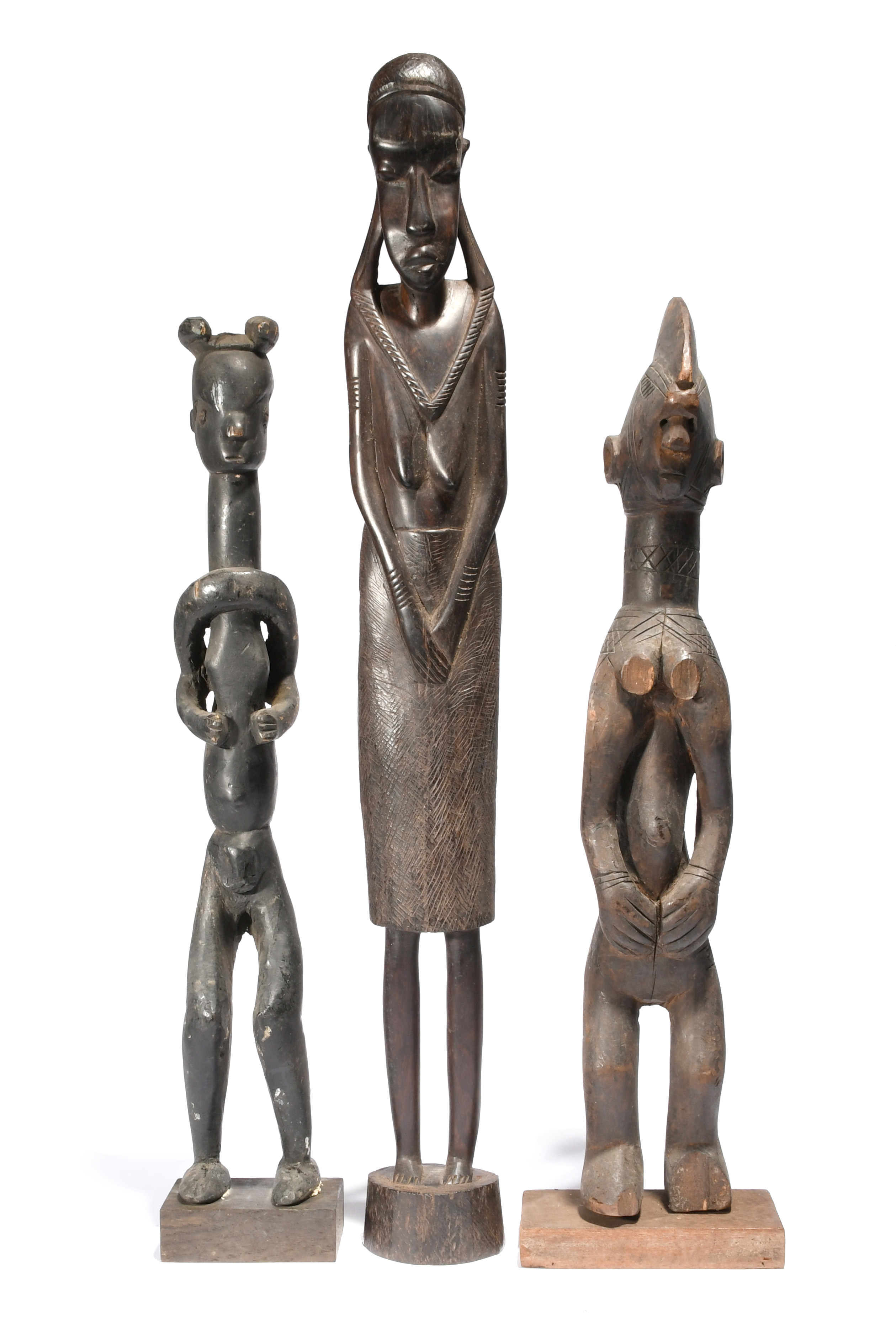 a Wurkun standing male figure, 46cm high, on a base and a Kenya carved female figure, 61.5cm high. (5)