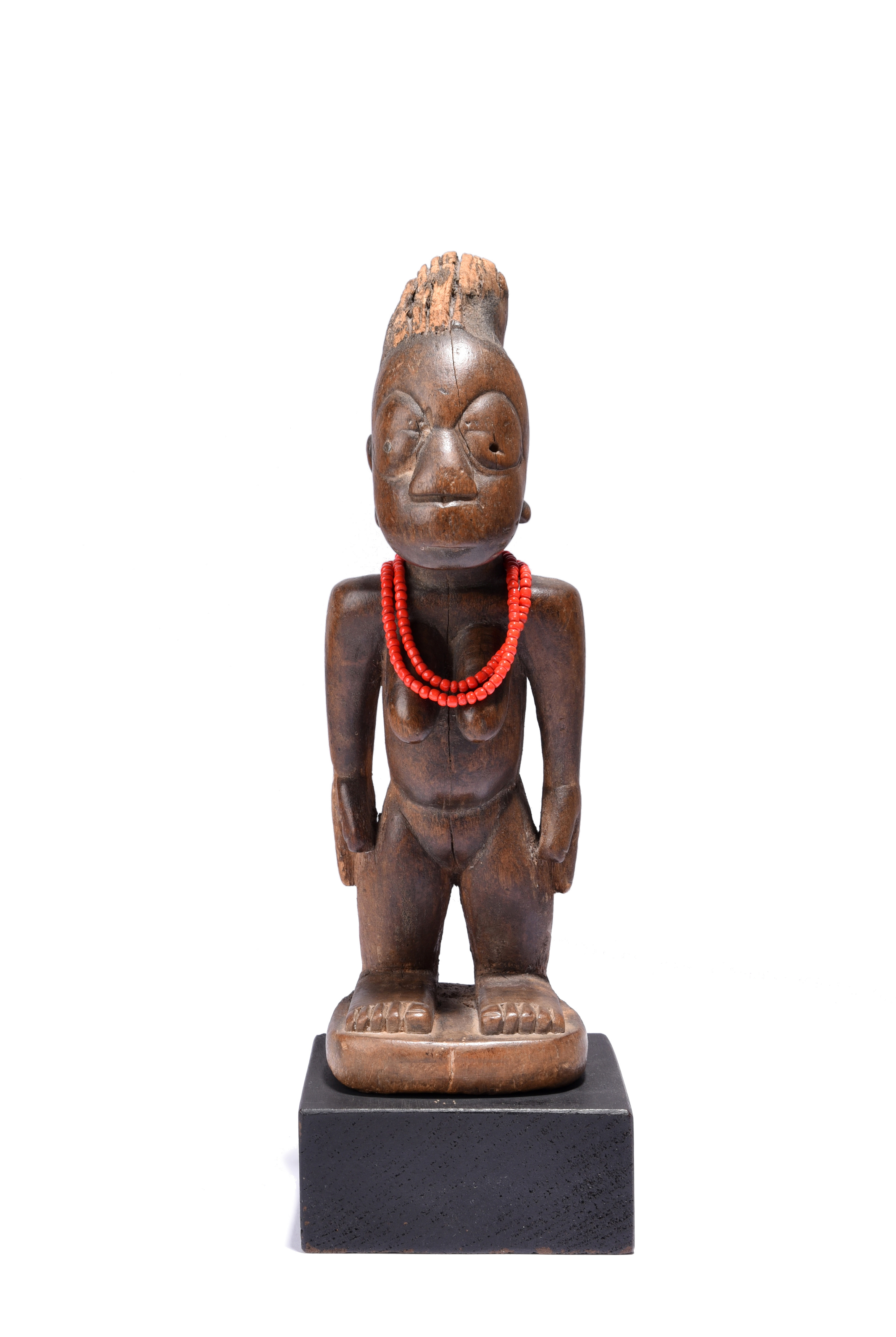 with facial scarifications and a metal pin to the right eye, wearing a red bead necklace,