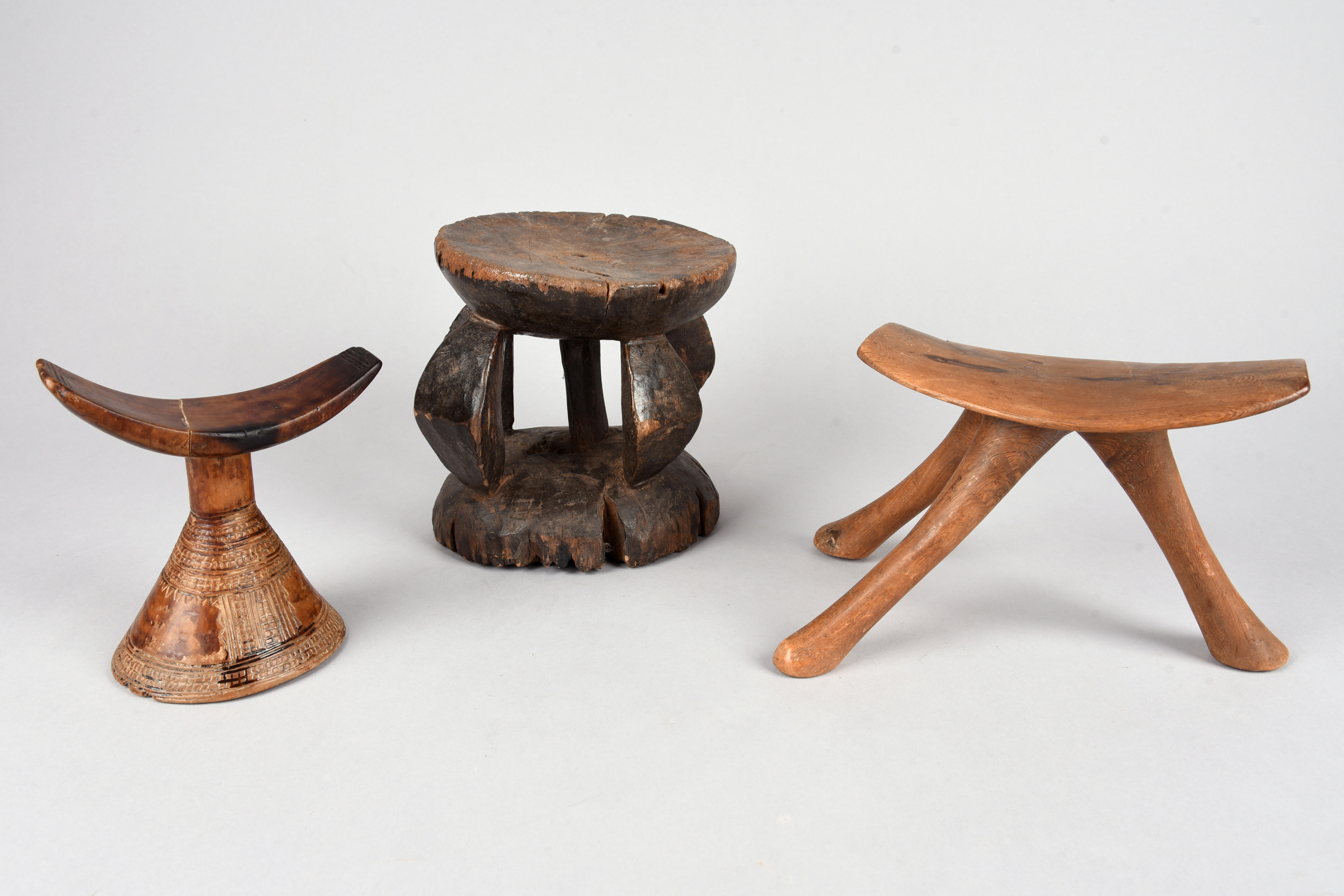 an Oromo headrest, 16cm high and an East Afrian tripod headrest, 15.5cm high. (3)