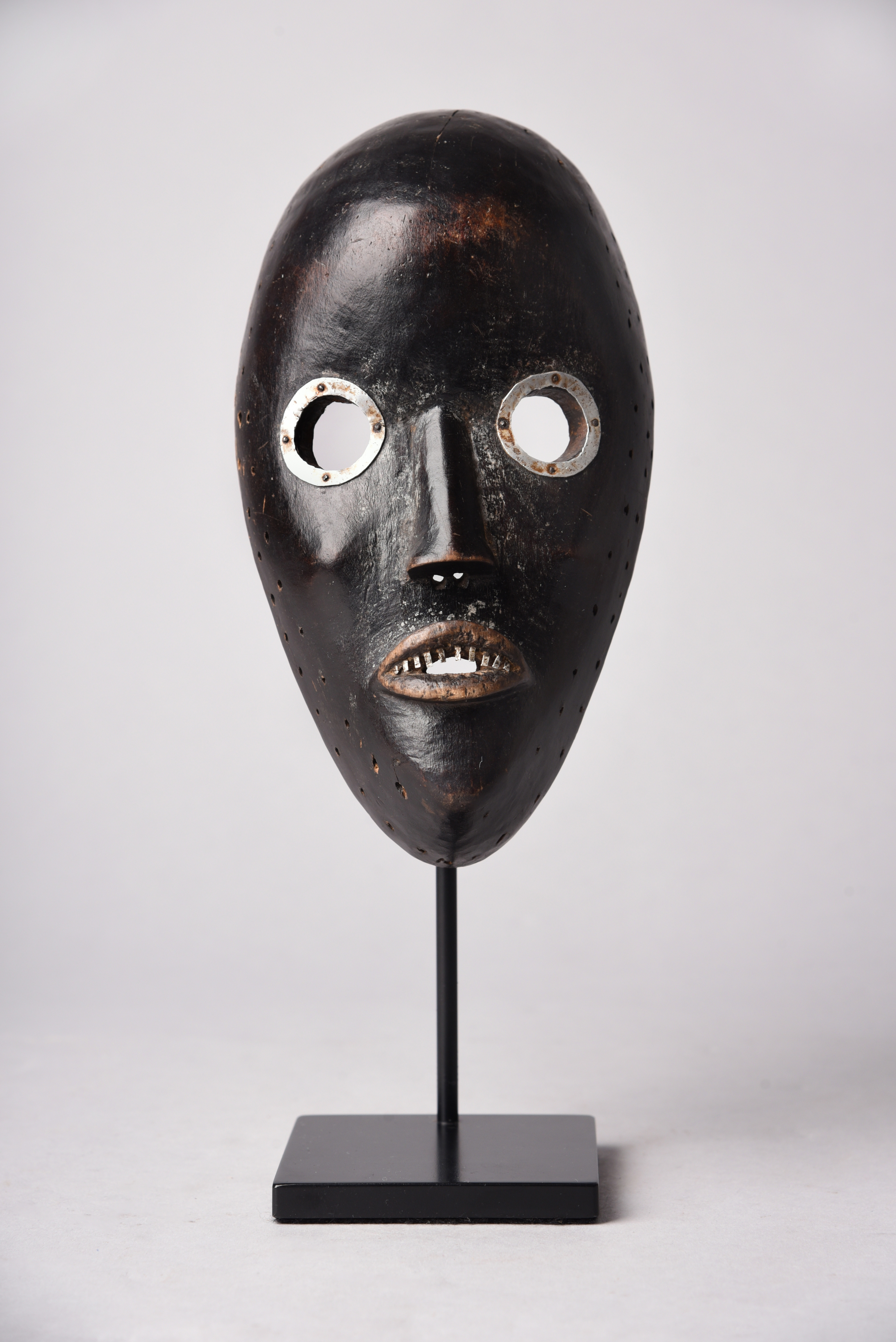 with aluminium discs around the eyes and inset teeth to the top of the open mouth,