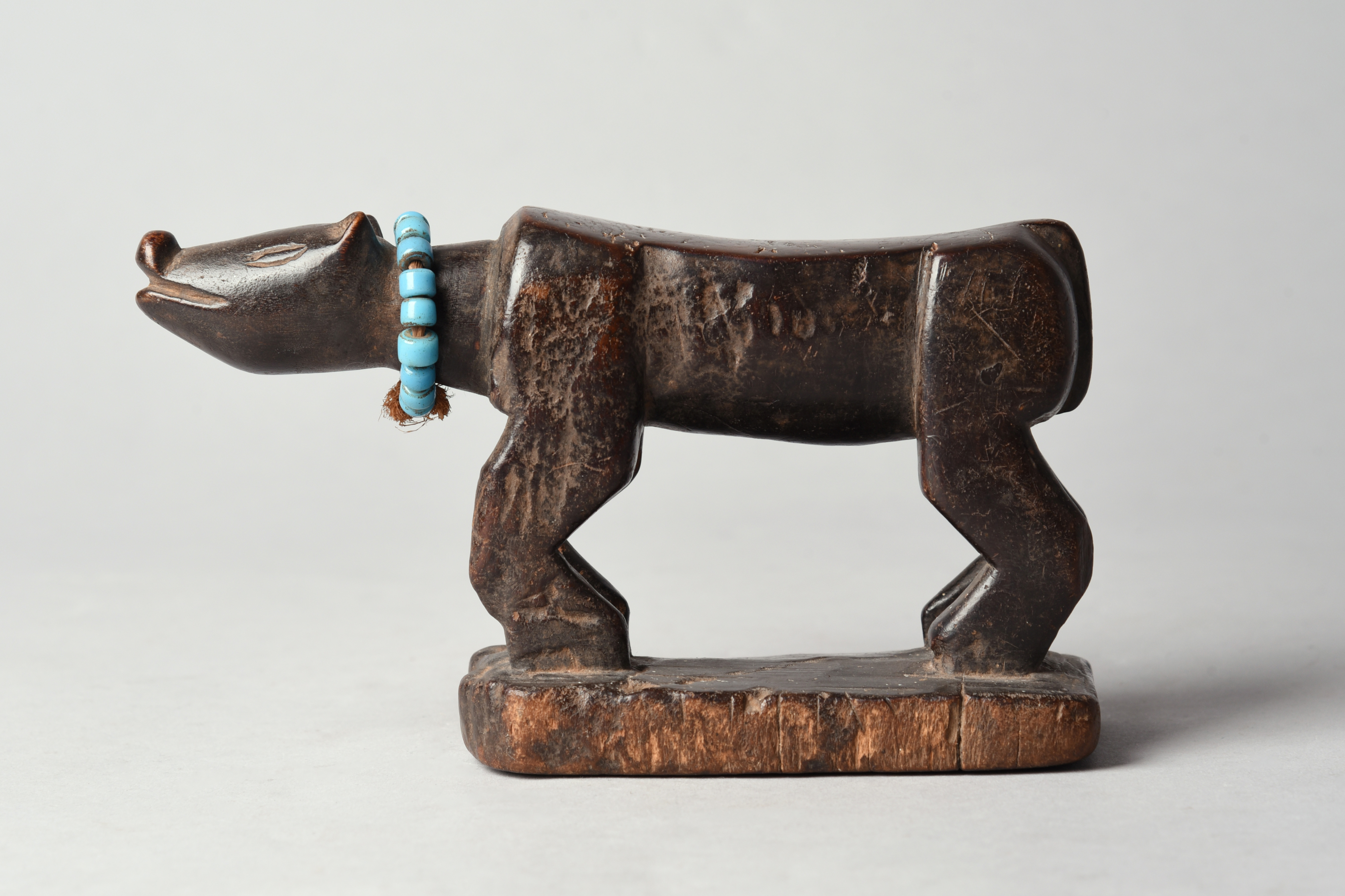 modelled as a walking pig, with a blue glass bead necklace,