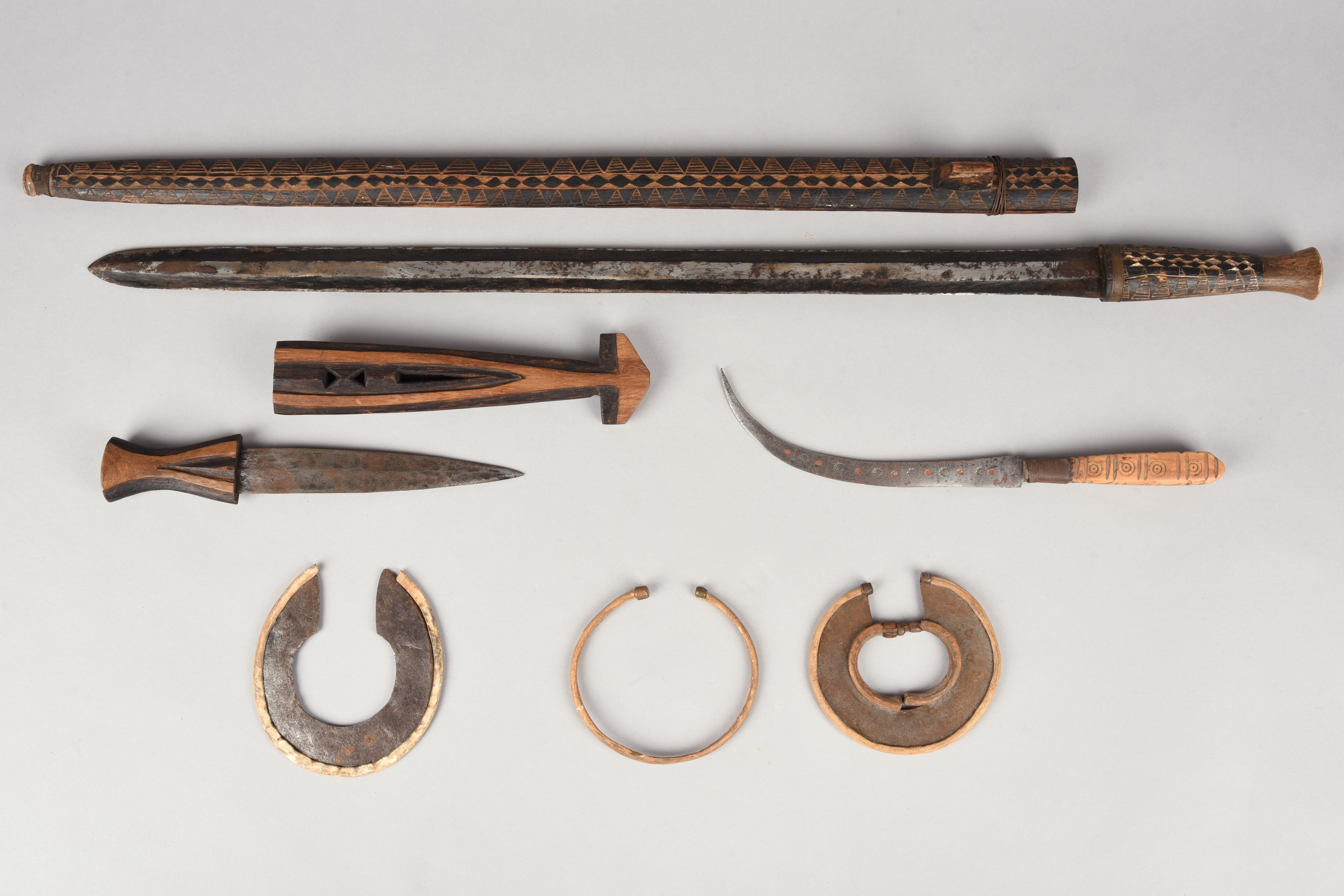 A Rwanda short sword, with a carved decorated handle and sheath, 75.7cm long, two Turkana wrist knives and a North African curved blade knife. (8)