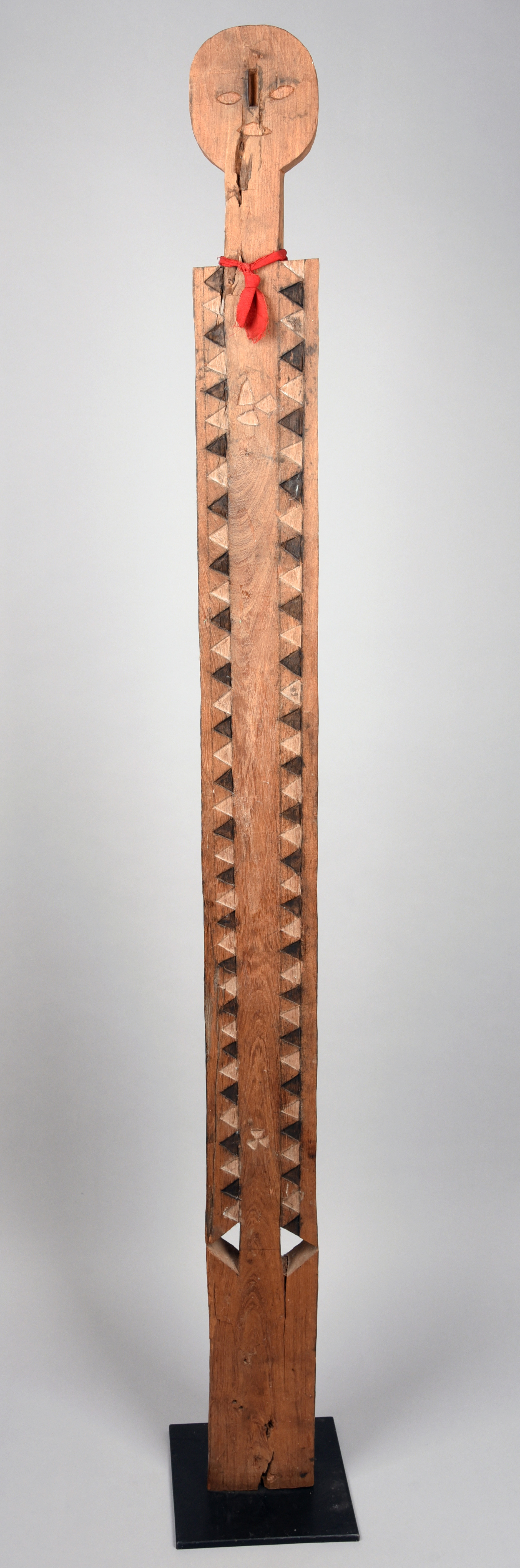 the carved body with remains of black and white pigment, with a red cloth neck tie,