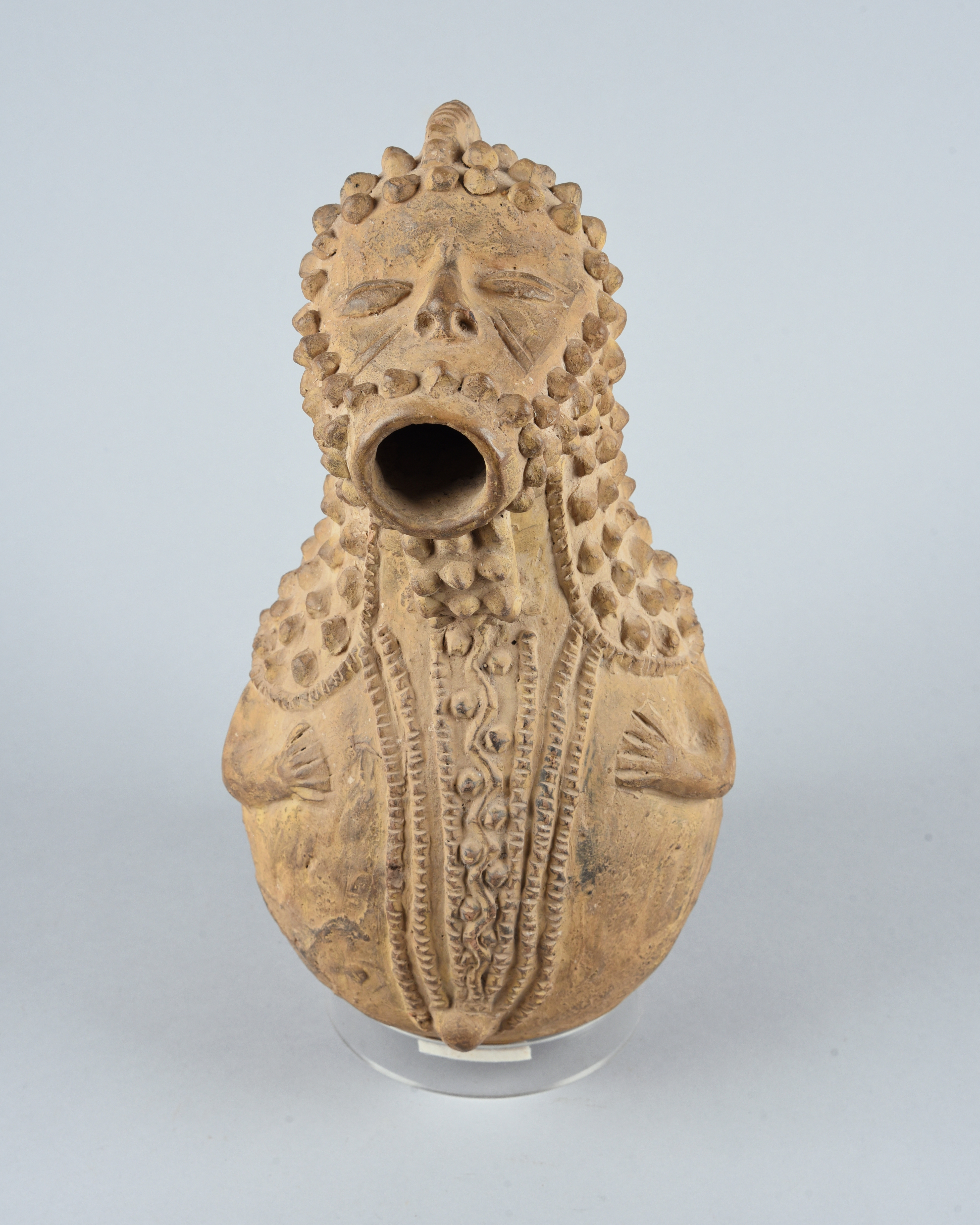 pottery, of bulbous form with relief decoration and a pair of arms, the crested head with a circular mouth and applied nodules, the back with a circular aperture,