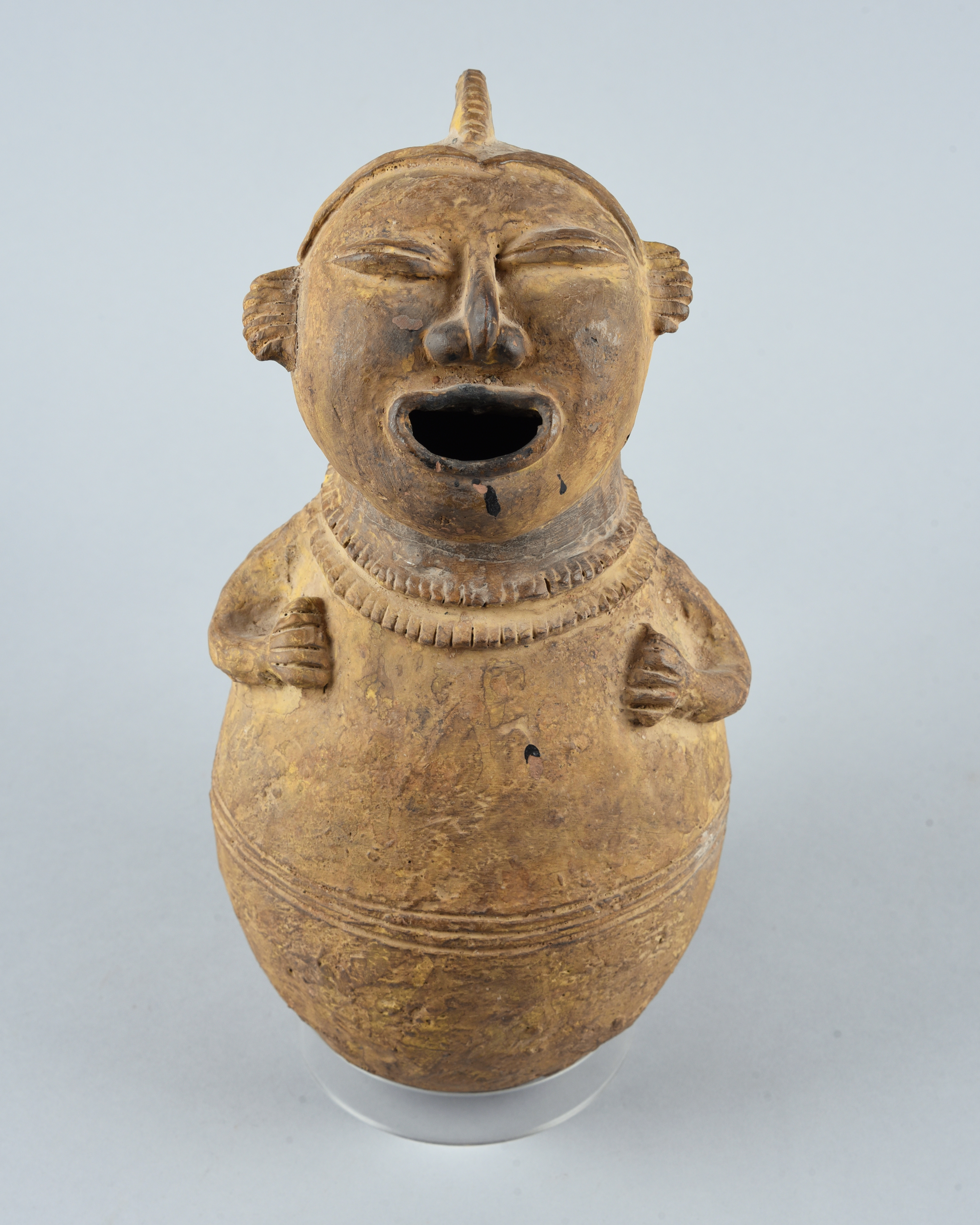 pottery, with a bulbous body having an incised linear girdle with a pair of arm above, the crested head with a semi-circular open mouth and a reeded handle,