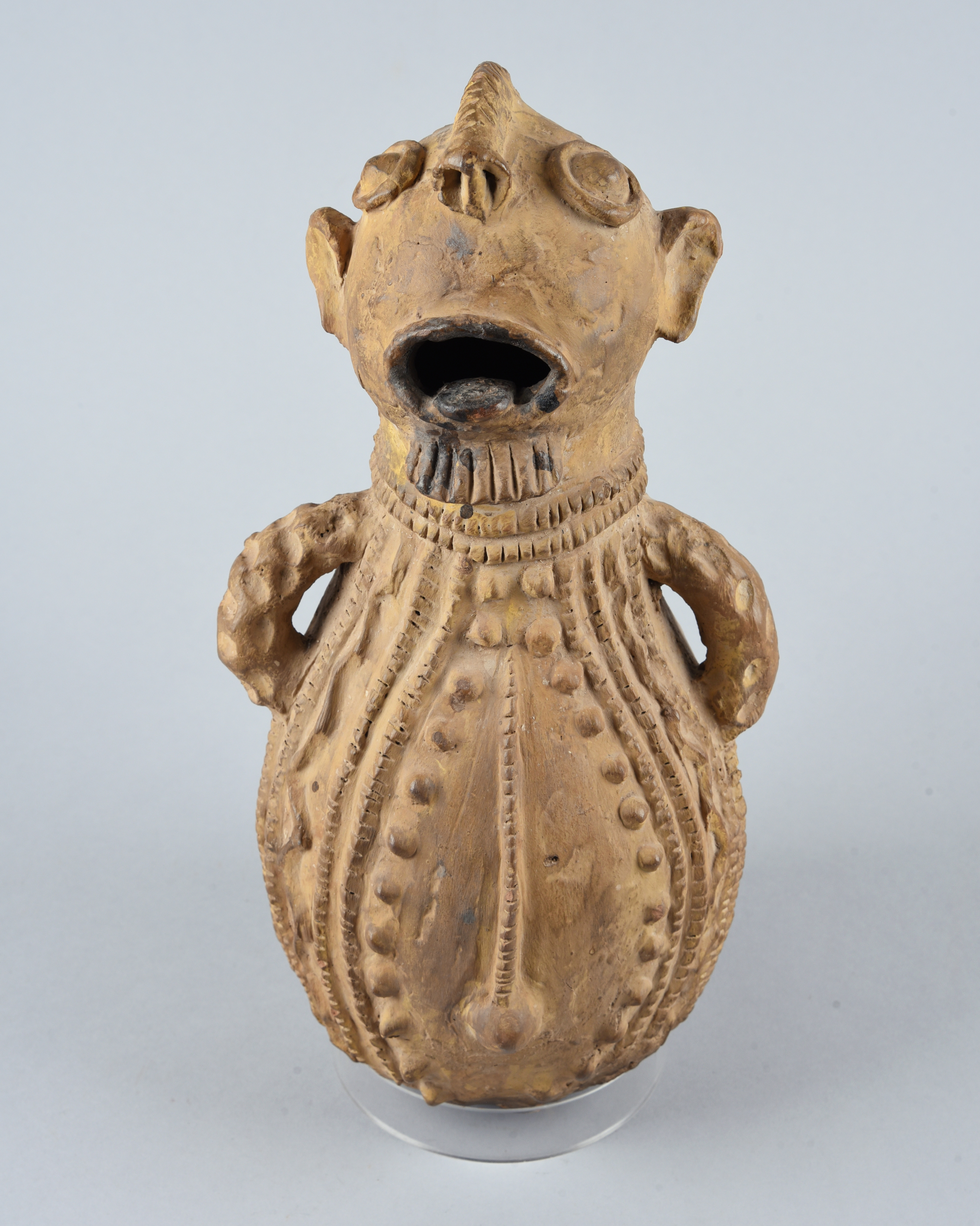 pottery, the bulbous body with applied decoration and a pair of open handles, the head with an open mouth with a tongue and beard,