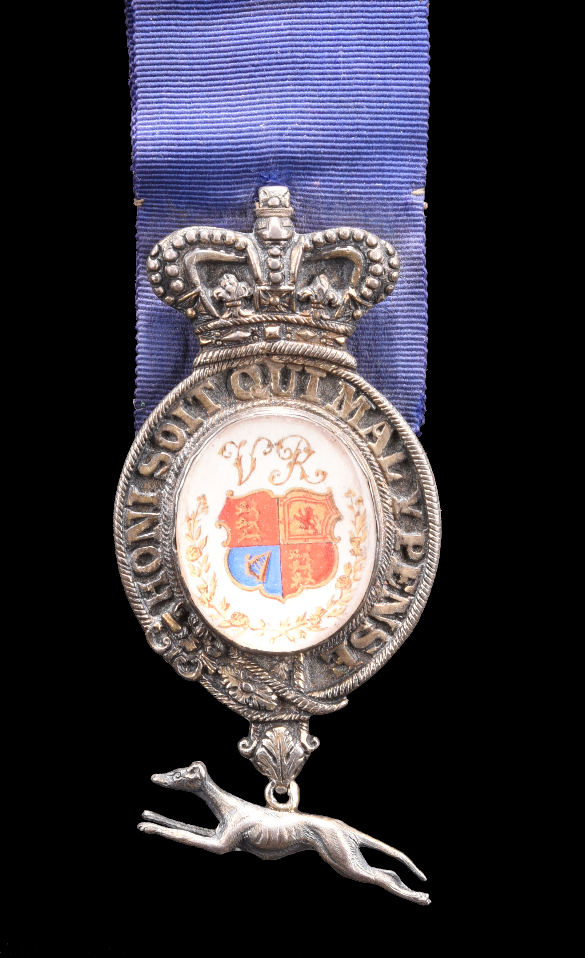A scarce Victorian Queen's Messenger's Badge, oval, with gilt and poly-chrome painted central plaque displaying the royal arms and cypher within a wreath and enclosed by a crystal cover; encircling garter with roped edges surmounted by a crown and with pendent running greyhound; the whole suspended from a broad blue ribbon with horizontal brooch pin; badge approximately 3 in. high (excluding greyhound) and 1.6 in. wide, no visible hallmarks; very fine or better, may sometime have had enameling to the crown and the garter.