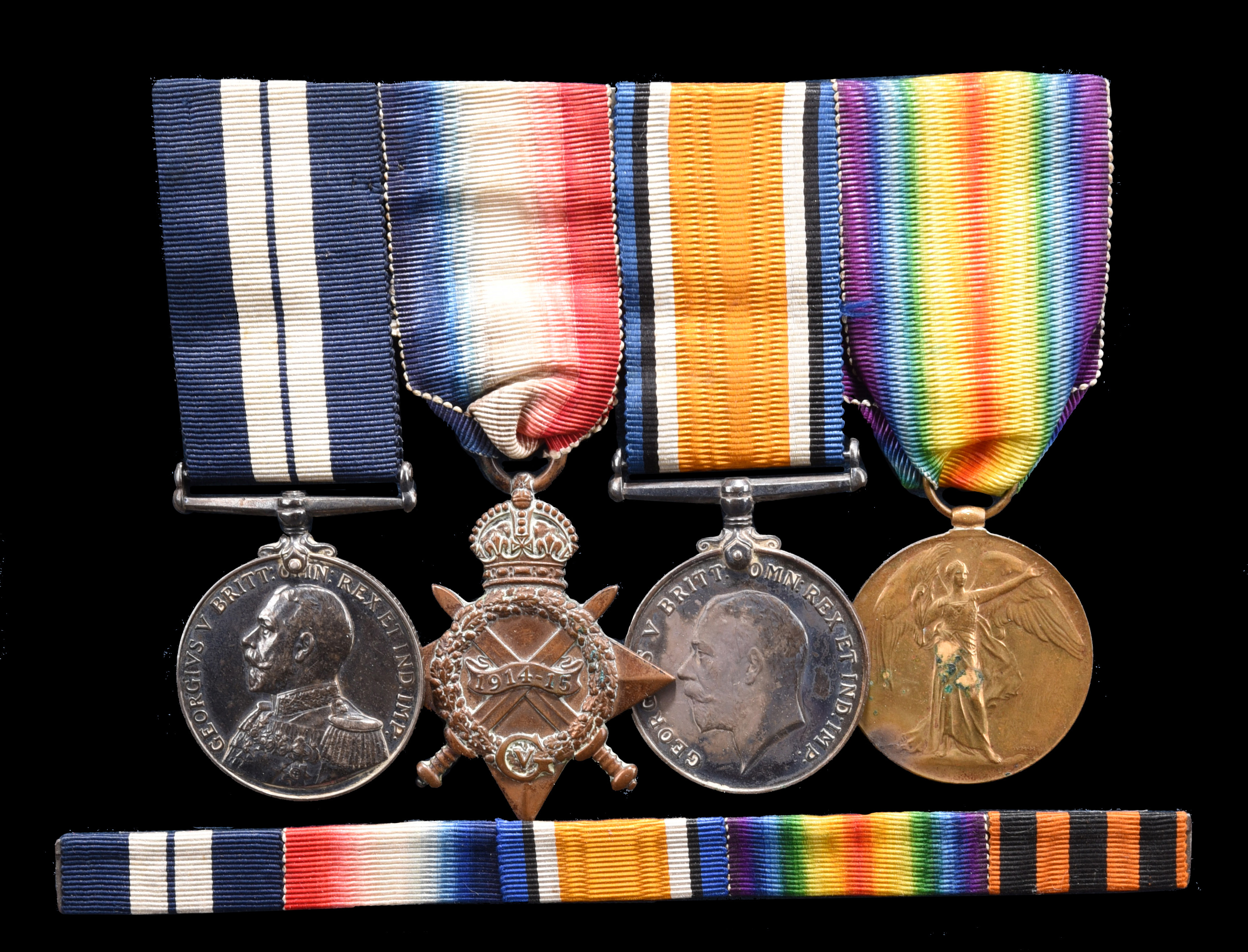 A First World War Belgian Coast D.S.M. group of five medals to Leading Telegraphist Alexander McKintosh Cowie, Royal Navy: Distinguished Service Medal, George V (J. 18622. A. M.CK. COWIE, LDG TEL "EREBUS" BELGIAN COAST. 1, JULY - 11, NOV. 1918), slightly irregular chamfer to edge, terminal date numerals run together, good very fine and attractively toned; 1914-15 Star (J. 18622, A. MCK. COWIE, TEL., R.N.), very fine; British War and Victory Medals (J 18622 A. MC K. COWIE. L. TEL. R.N.), some discolouration, otherwise very fine or better; Russia: Medal of St George for Bravery, 3rd Class, a modern replacement copy, nearly extremely fine; the first four mounted for wearing. [5] Offered together with the recipient's personal journal of the war for 1916, a mounted group of five dress miniature medals, ribbon bars, a presentation copy of the D.S.M. recommendation, photographs including the recipient, and a small collection of other ephemera.