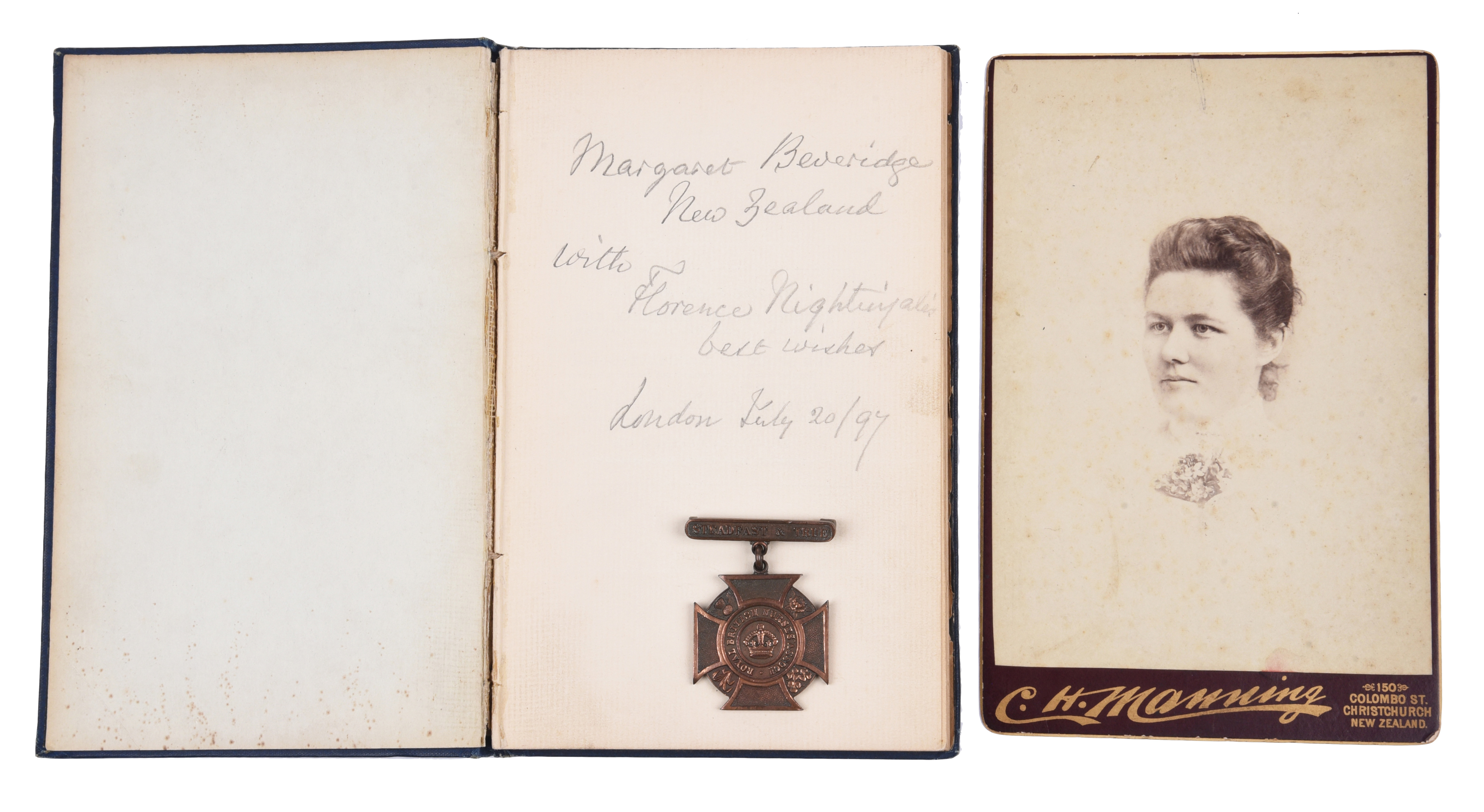 Florence Nightigale interest: a bronze Royal British Nurses Association badge, Margaret M. Beveridge 3882; together with a copy of a religious publication with manuscript pencil dedication to Nurse Beveridge: "Margaret Beveridge New Zealand with Florence Nightingale's best wishes London July 20/97"; also Beveridge's R.N.B.A. Trained Nurse's Registration Certificate, her portrait photograph, and other items.