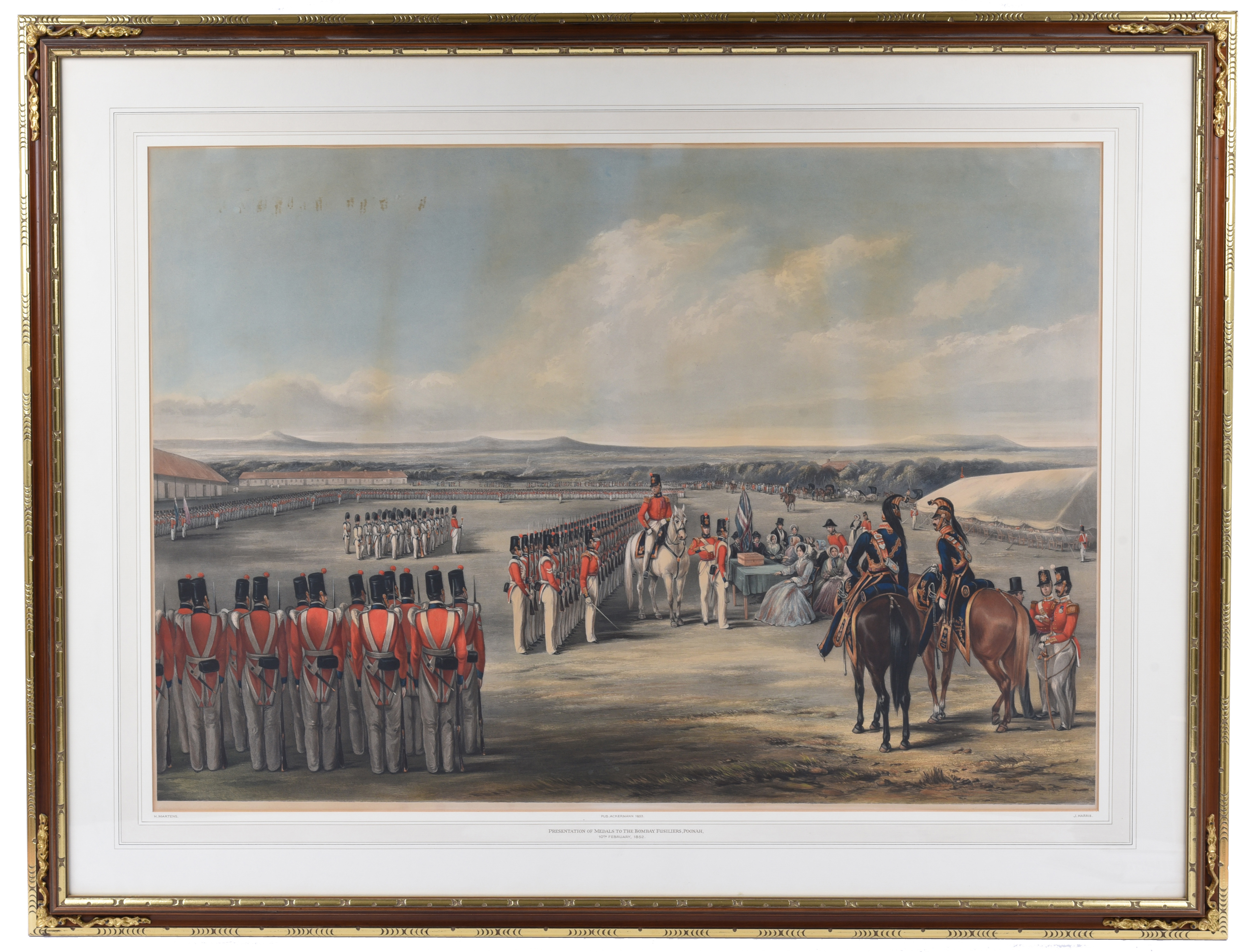 After H. Martens, 'Presentation of Medals to the Bombay Fusiliers, Poonah, 10th February 1852', hand coloured aquatint, 53 x 75 cm, in a glazed and gilt frame by Parker Gallery.