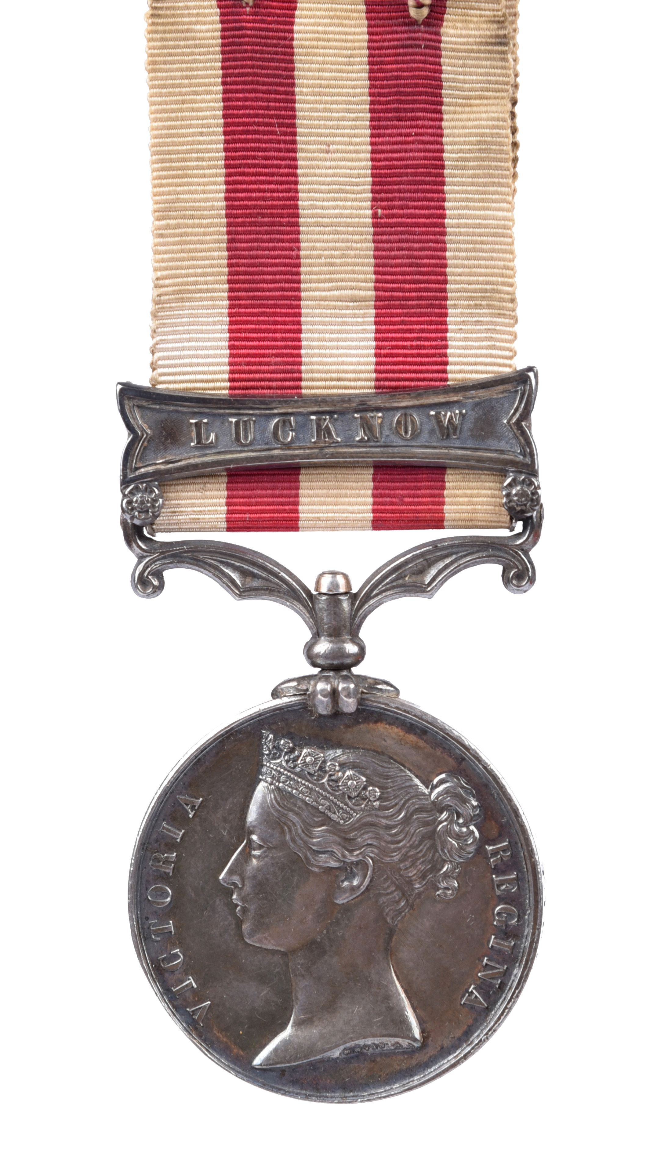 An Indian Mutiny Medal 1857 to Lieutenant Robert Fannin Stoney, 53rd (Shropshire) Regiment of Foot, clasp: Lucknow (LIEUT R.F. STONEY. 53RD REGT.), a little edge bruising and abrasion, nearly extremely fine and attractively toned; together with an overpainted uniformed portrait photograph of the recipient, wearing his medal ribbon; a letter written by him to his parents, from Lucknow, April 7th 1858; a uniformed portrait of his Brother Richard B. Stoney, Royal Artillery (died 1861), documents pertaining to Richard's training at Woolwich; and other items.