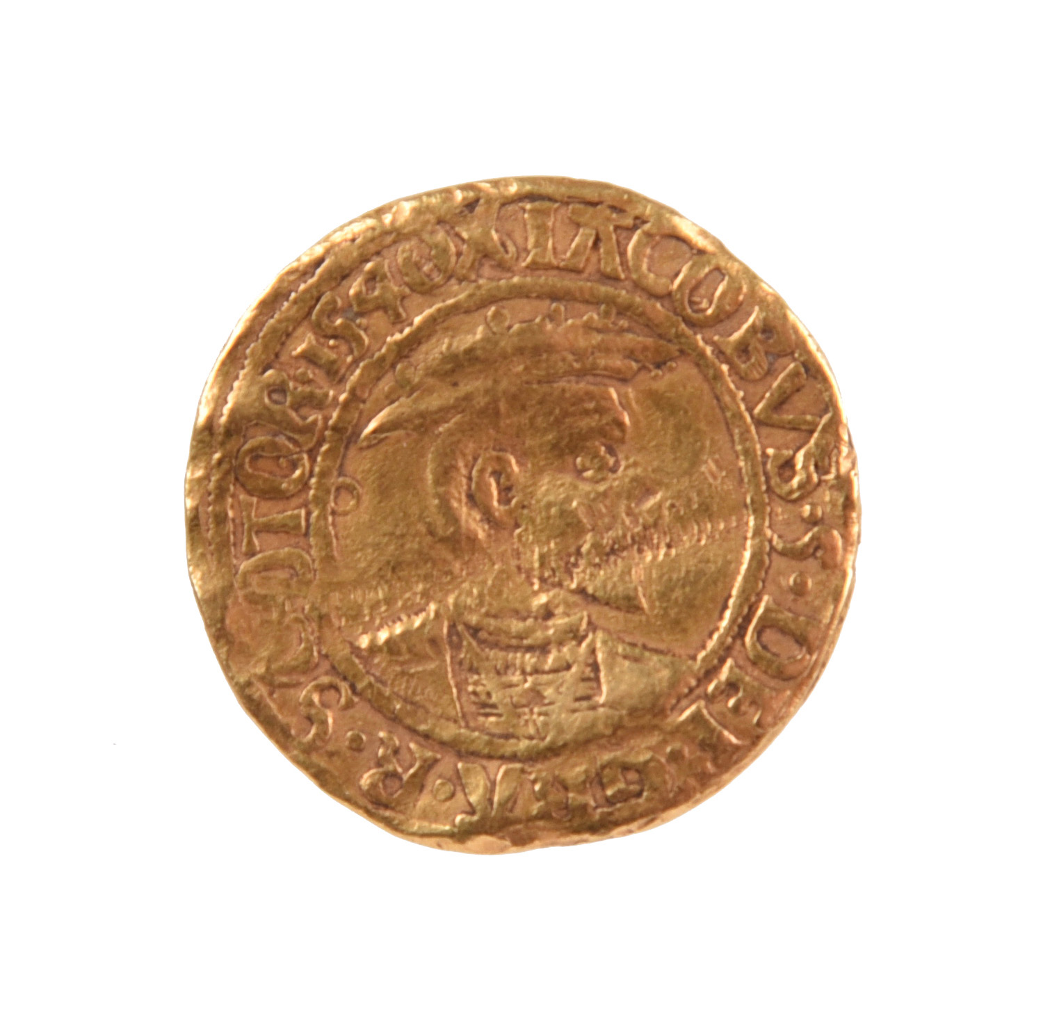 Scotland: James V (1513-42), gold ducat (bonnet piece), 1540, bearded bust right wearing bonnet, rev. crowned arms, 5.68g (S 5373), creased and with heavy abrasion to face and adjacent field, about fine.
