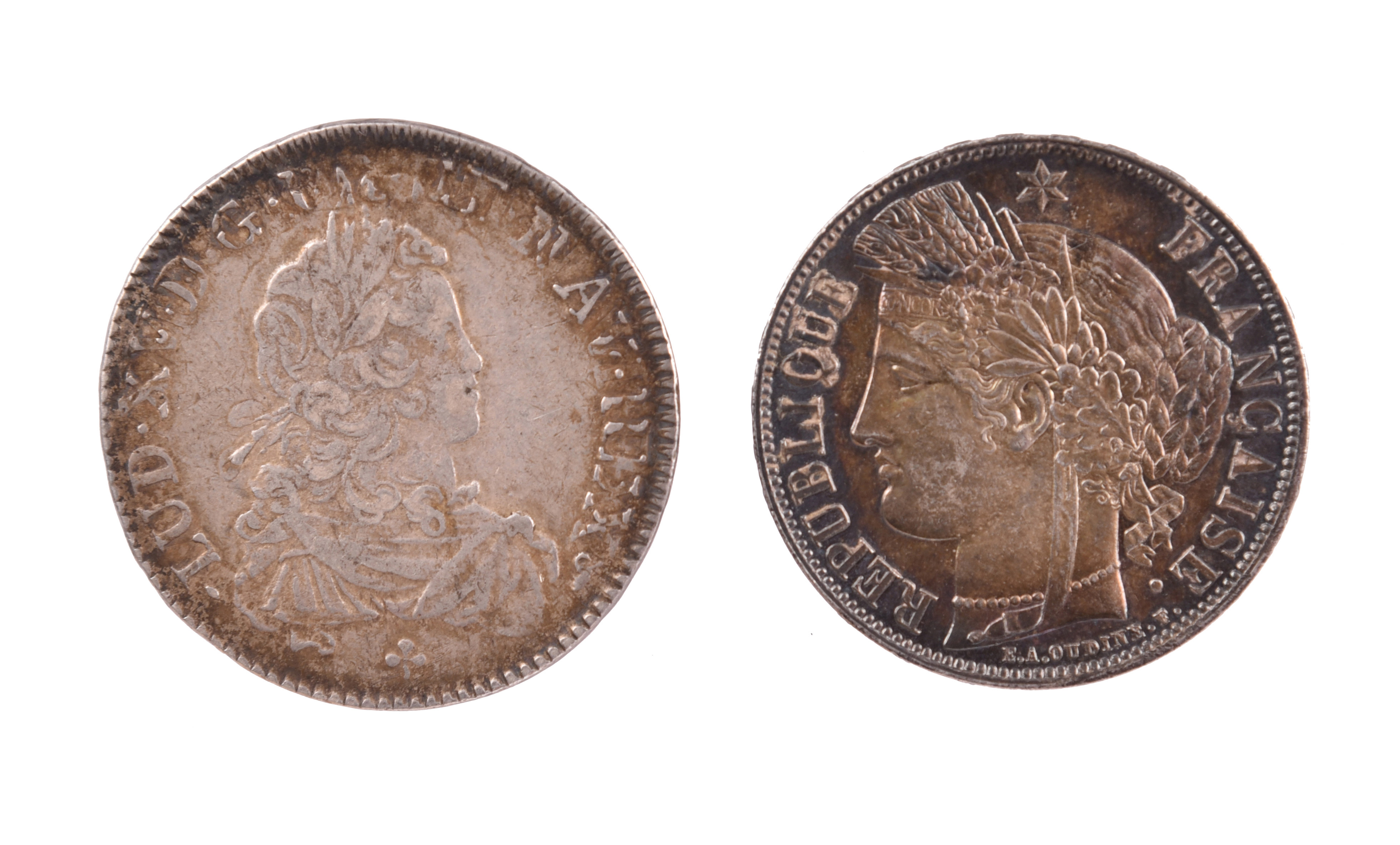 France: Louis XV (1710-74), silver ecu, 1721, Amiens, m.m. clover, 24.32g, much undertype, good fine; together with: Second Republic, five francs, 1851, 24.98g, extremely fine and toned. [2]