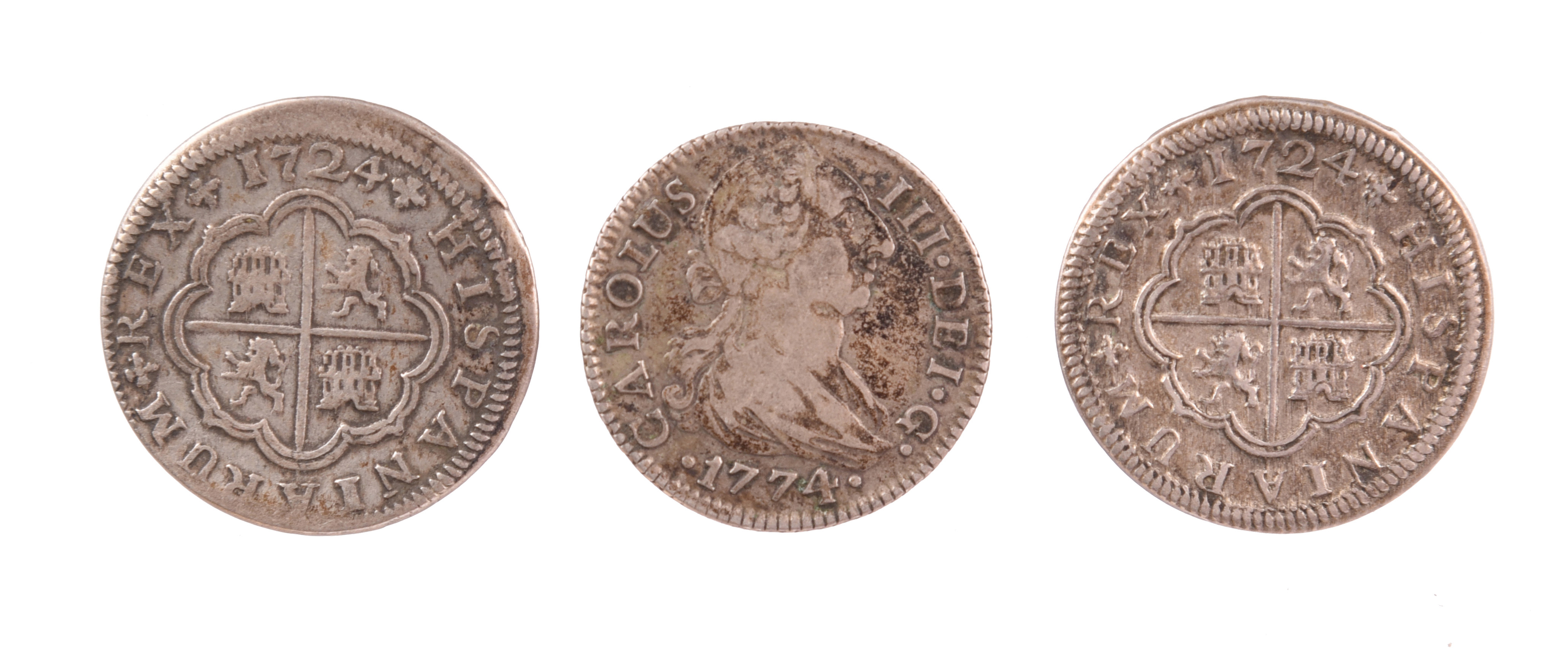 Spain: Philip V, silver two reales, 1724, slightly buckled, good fine; another two reales, Louis I, 1724, buckled, otherwise very fine; and another, Charles III, 1774, about very fine. [3]