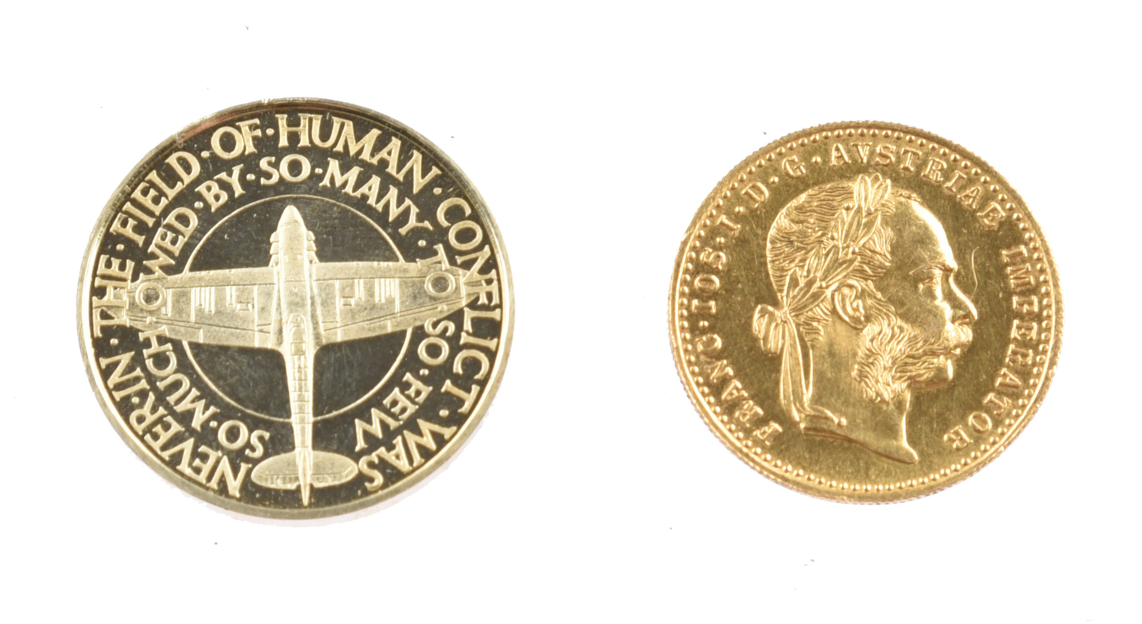 Austria: Franz Joseph, gold ducat, 1915, trade coinage (KM 2267), about extremely fine; together with: 25th anniversary of the Battle of Britain, an 18 carat gold medal, 22 mm, a Spitfire in plan view, rev. RAF badge, 8.2g, boxed, extremely fine. [2]