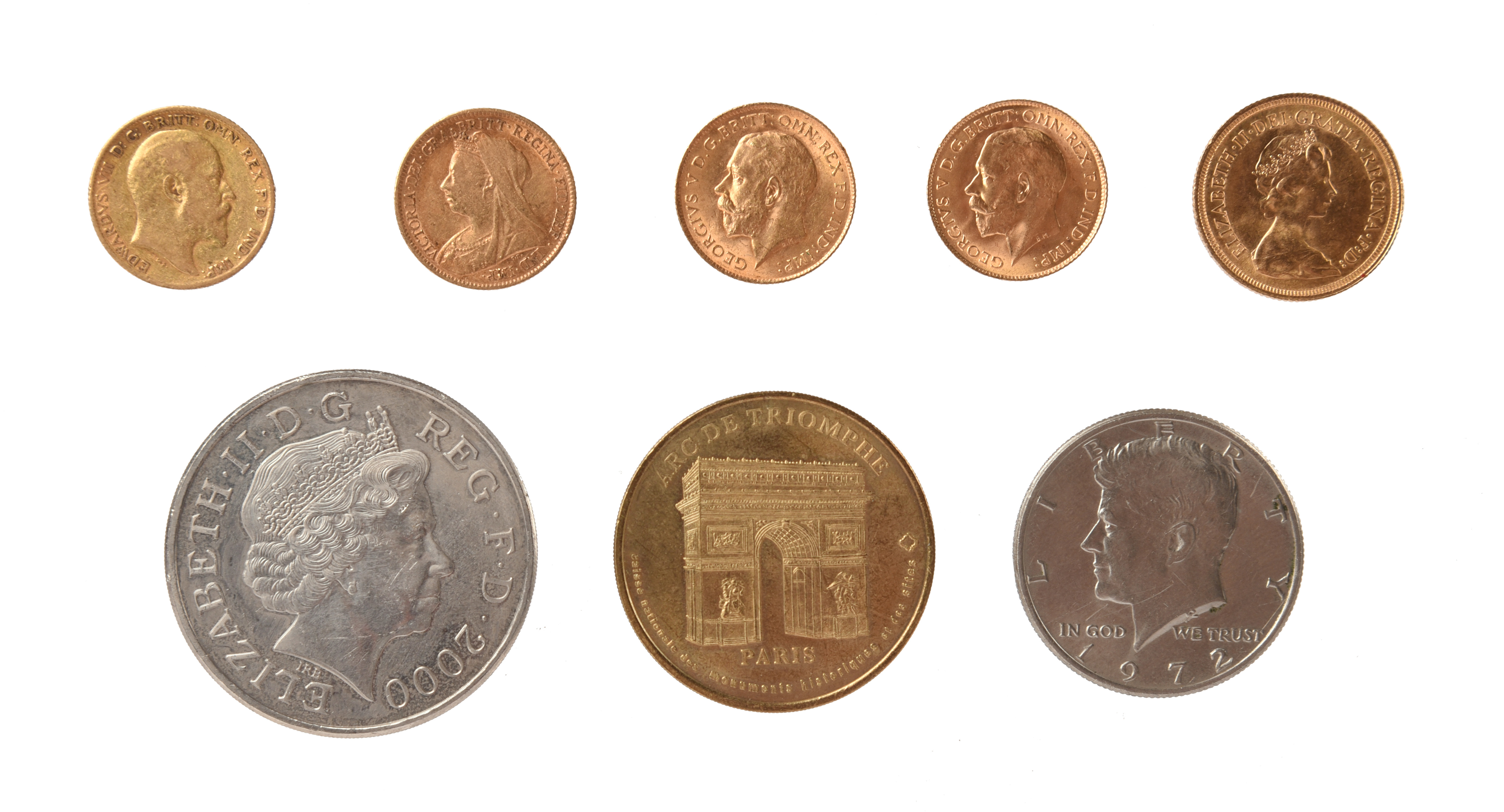 A small quantity of coins, comprising: Victoria, gold half sovereign, 1900, fine; Edward VII, gold half sovereign, 1906, good fine; George VI, gold half sovereigns (2), 1914, one very fine, one extremely fine or nearly so; Elizabeth II, gold sovereign, 1974, extremely fine or nearly so; commemorative five pounds, 2000, nearly extremely fine; U.S.A.: half dollar, 1972, good very fine; and a commemorative token, Paris, 2000. [8]