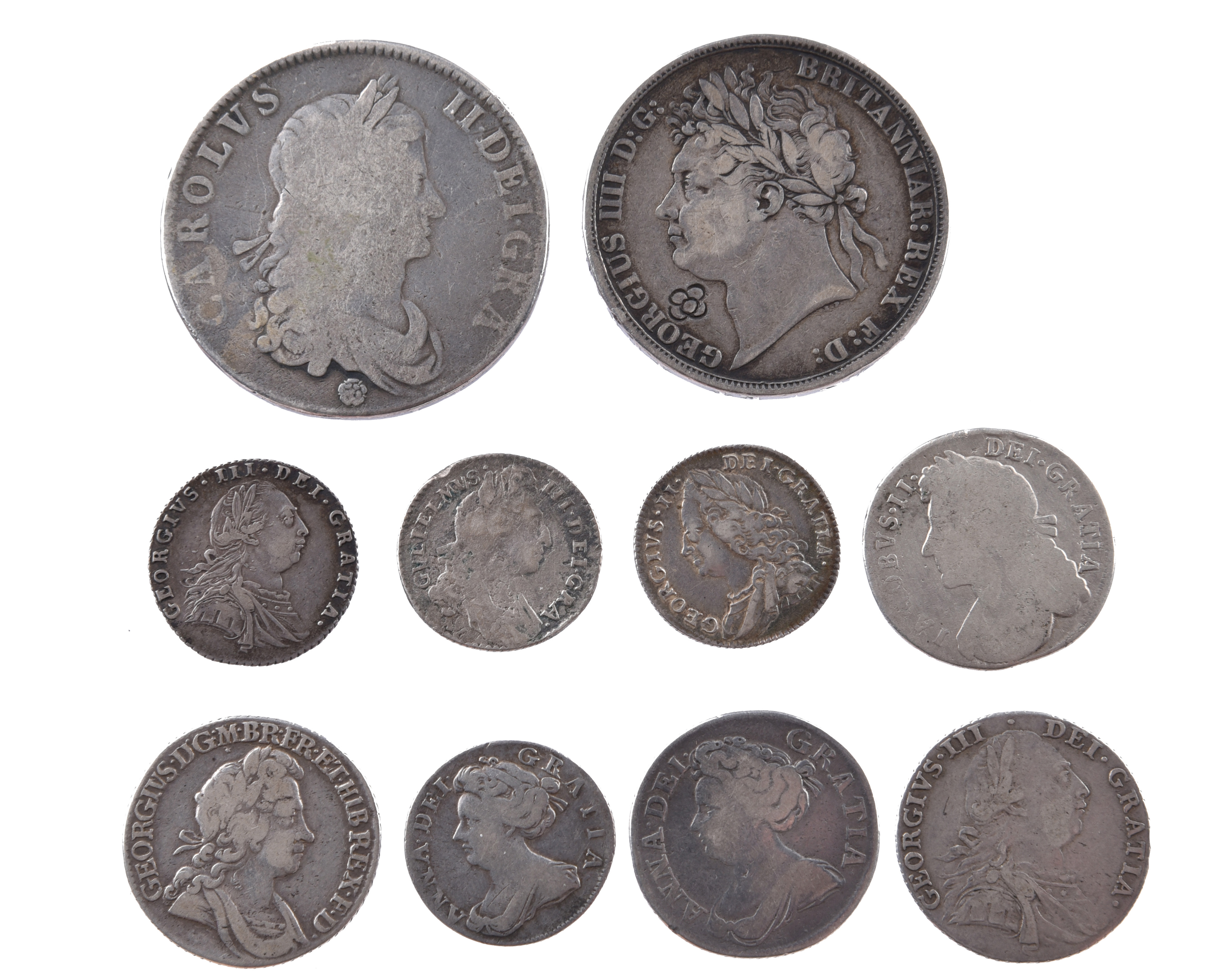A small collection of English and British silver coins, comprising: Charles II, crown, 1662 (S 3350), fair; James II, shilling, 1685 (S 3410), fair; William III, sixpence, 1696 (S 3538), fine; Anne, shilling, 1711, rev. plain angles (S 3610), fine; sixpence, 1705 (S 3591), fine; George I, shilling, 1723, second bust, rev. roses and plumes (S 3649), near very fine; George II, sixpence, 1757, old bust, rev. plain angles (S 3711), very fine; George III, shilling, 1787, rev. without semée of hearts (S 3743), near very fine; sixpence, 1787 (S 3748), good very fine; George IV, crown, 1822 (S 3805), crude flower head engraved near bust, otherwise near very fine. [10]