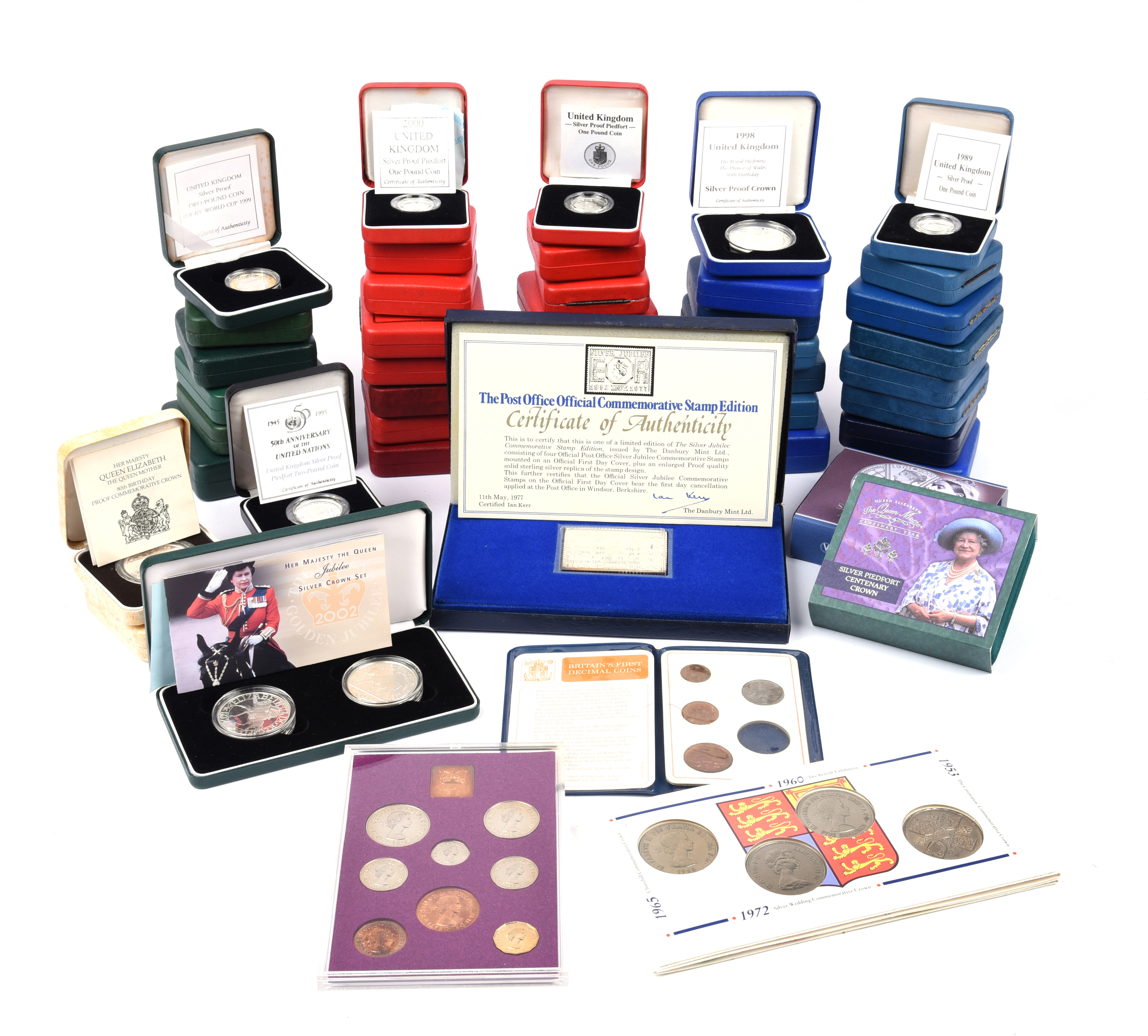 Forty-two cases of Royal Mint silver proof coins, mainly single coins but some double sets also, including: 1981 Royal Wedding crown, 1986 two pounds, 1990 5 pence (2 coins), 1992 10 pence (2 coins), 1993 five pounds, 1998 piedfort NHS 50th Anniversary fifty pence, 1997 piedfort fifty pence, 2003 DNA Double Helix piedfort two pounds, and many others; together with a small quantity of base metal sets. [qty]