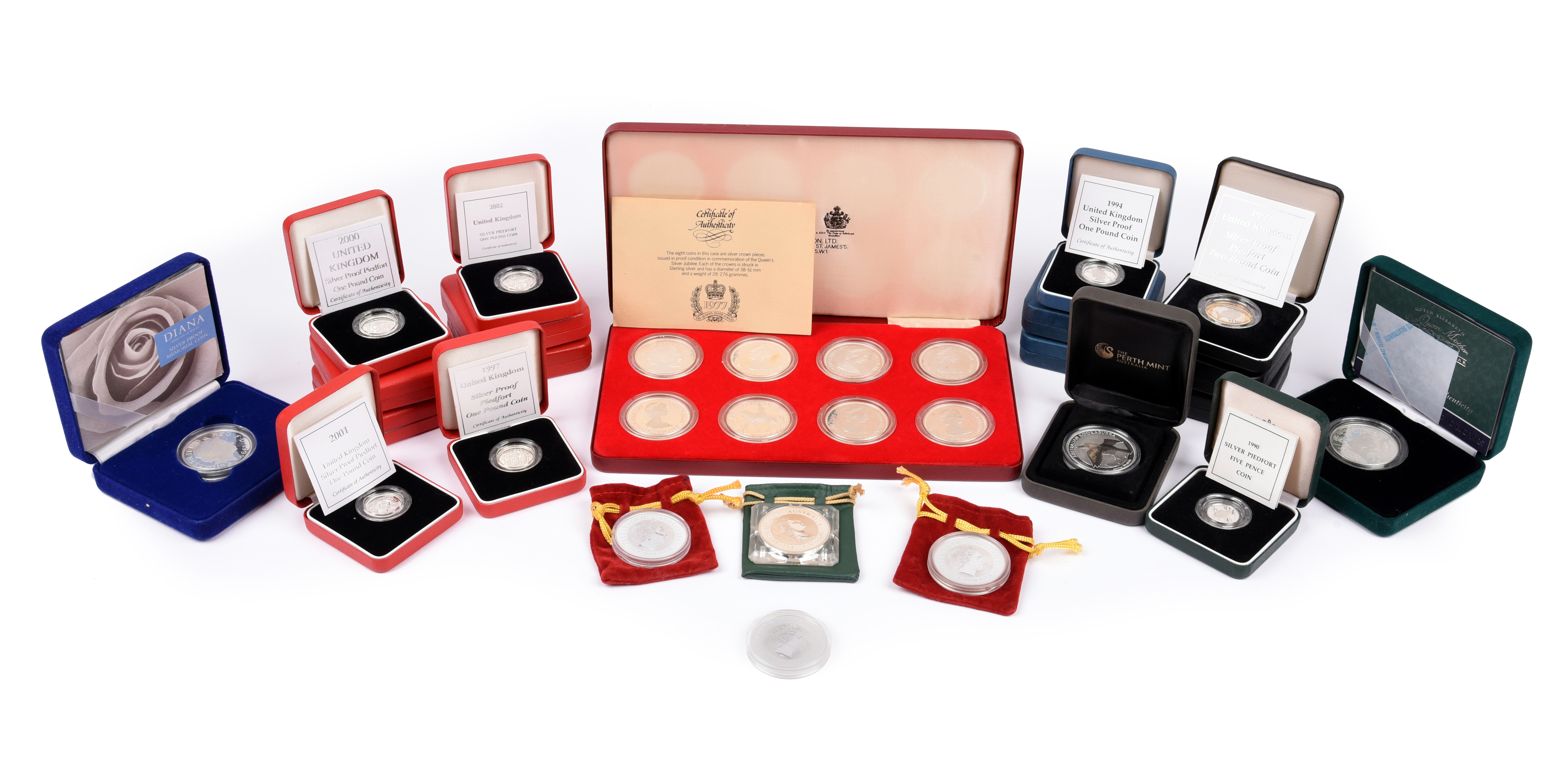 A collection of modern silver proof coins, British and Commonwealth, including: piedfort crown, 2000, Queen Mother; piedfort two pounds, 1996, football; piedfort two pounds 2001, Marconi; piedfort two pounds, 2003, DNA Double Helix; piedfot pound, 2001; piedfort five pence, 1990; others similar; together with Australia: dollar, 1995, .999 silver, kookaburra; four other such, 2000, 2006, 2011 and 2016; and a 1977 Jubilee collection of proof crowns, cased by Spinks; all cased, some with certificates, as struck. [30 coins]